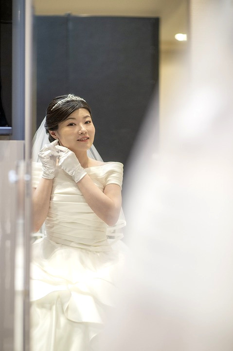 オフショルダーのドレスに、シニヨンスタイル×ティアラは