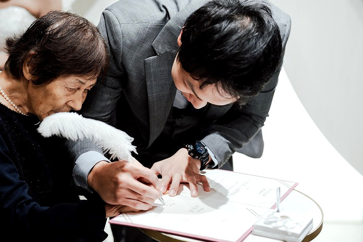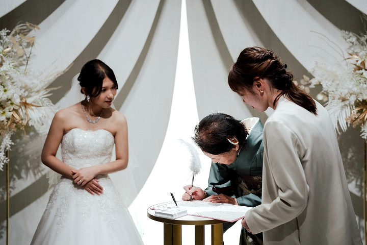 署名を書いて頂く姿を優しく見守る新婦様の表情が印象的です。