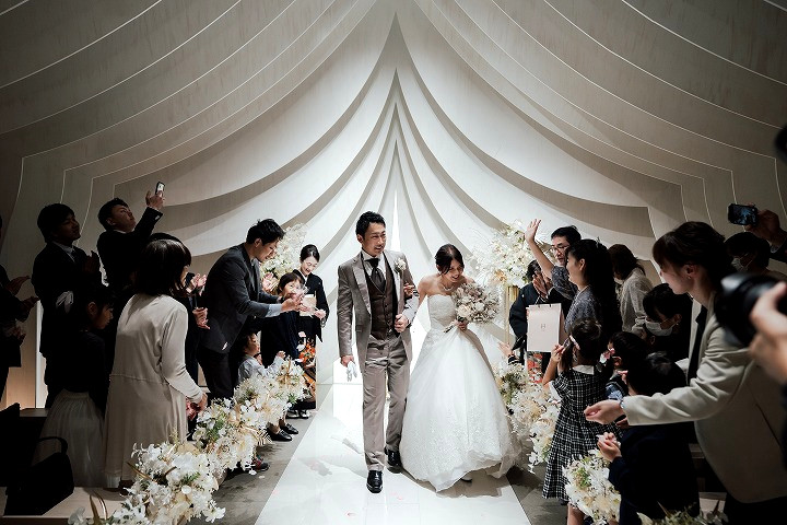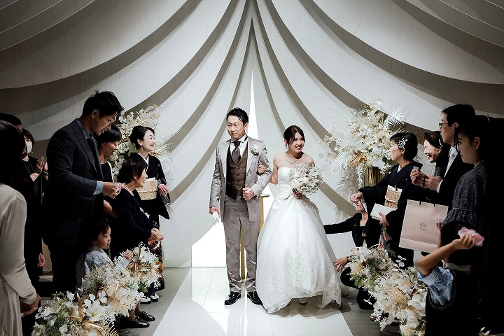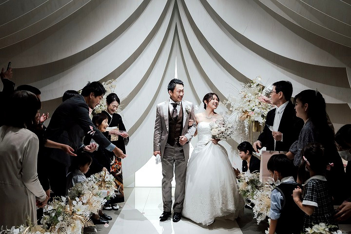 皆様の笑顔や祝福のシャワーの中、お二人も素敵な笑顔でご退場です!