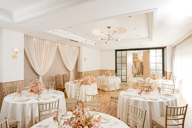 お二人のお直しが整うまで、ゲストの皆様にはパーティー会場で少しご歓談のお時間をお過ごしいただきます。