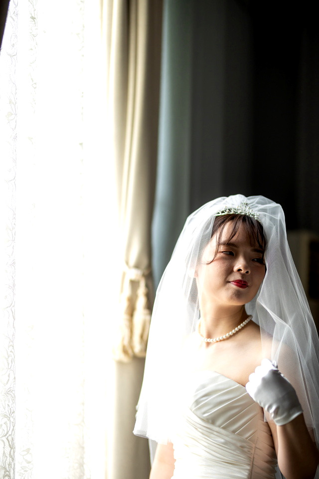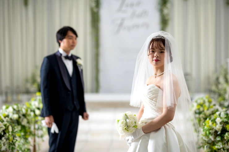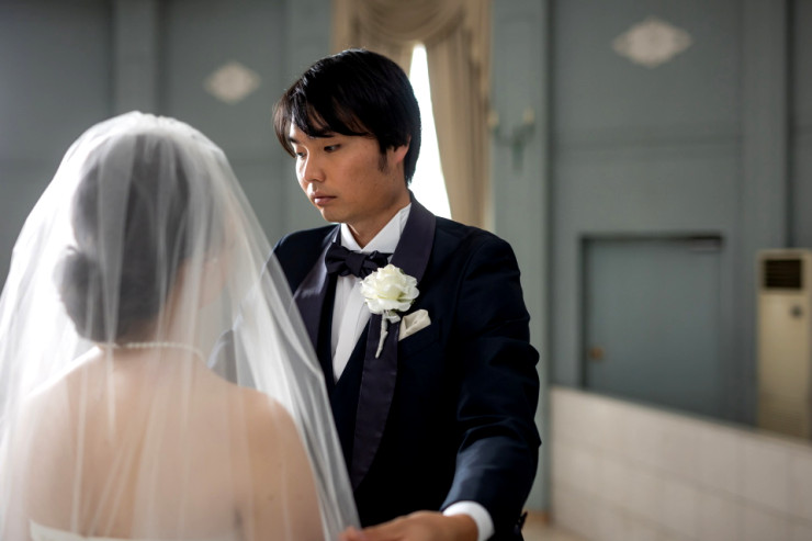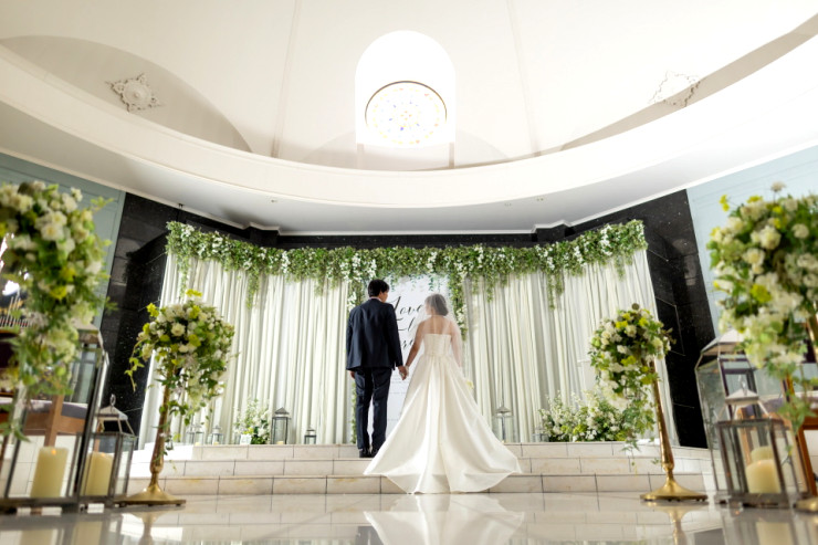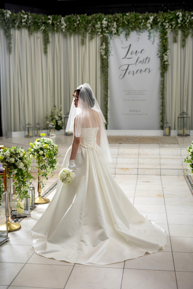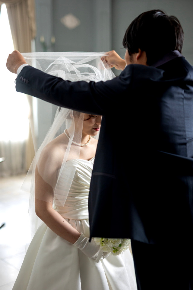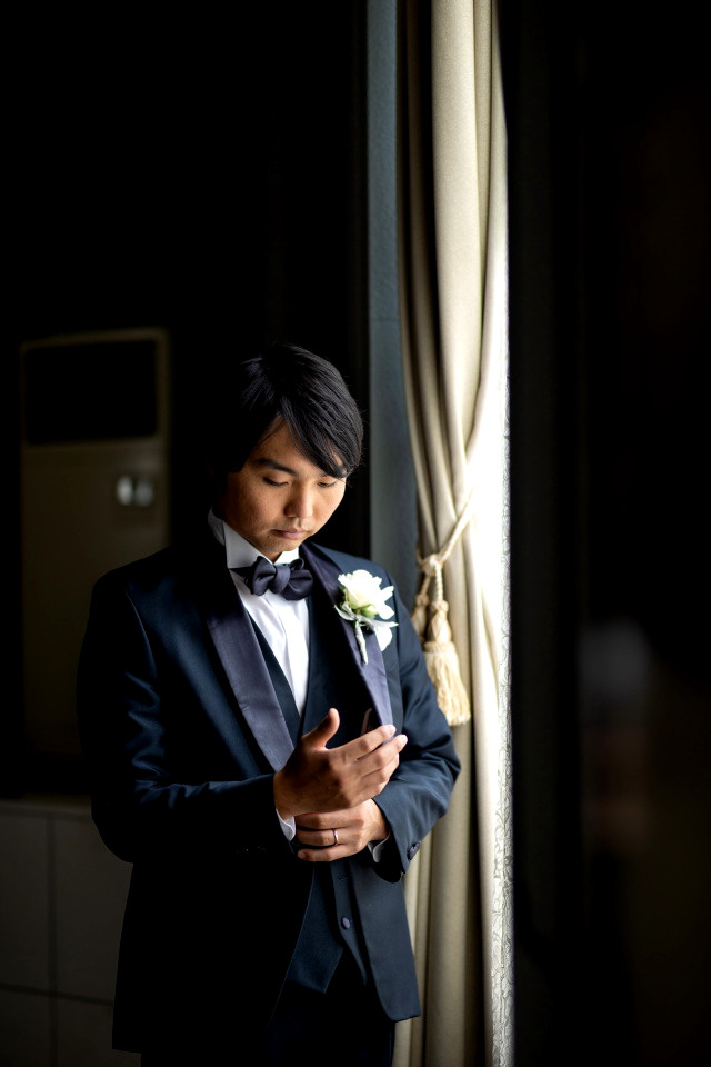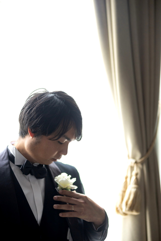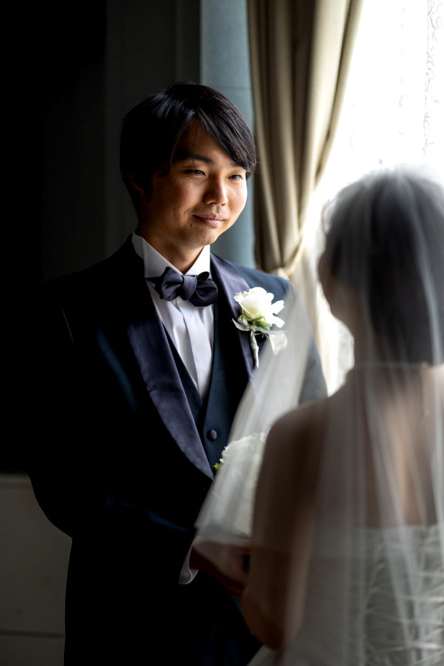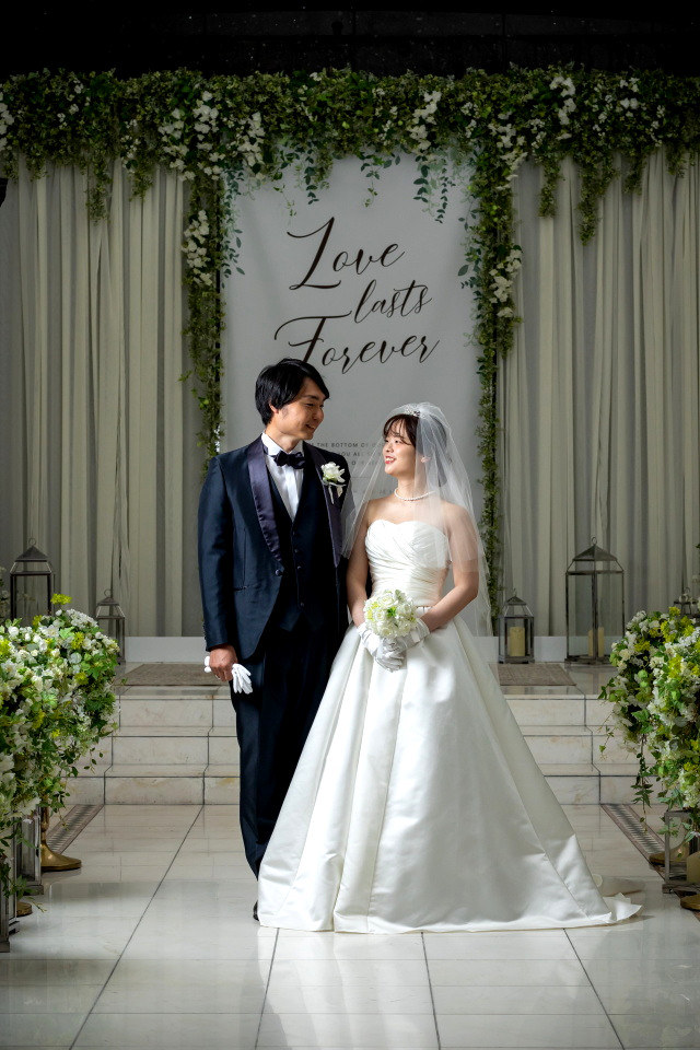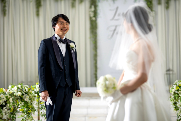 光沢感のあるブラックのタキシードと純白のウェディングドレスに