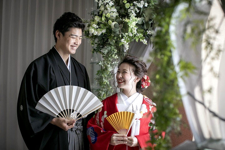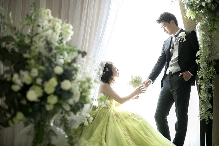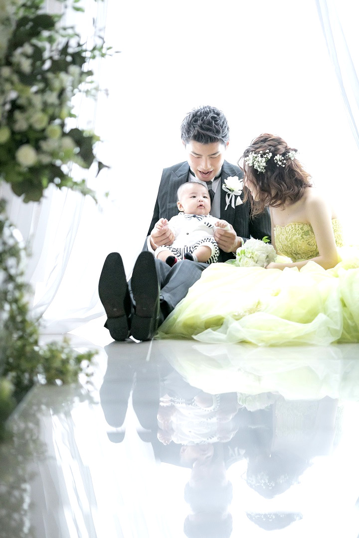 先日、新郎新婦様とお子様の3人でカラードレスと和装の2着前撮り撮影された方をご紹介します。