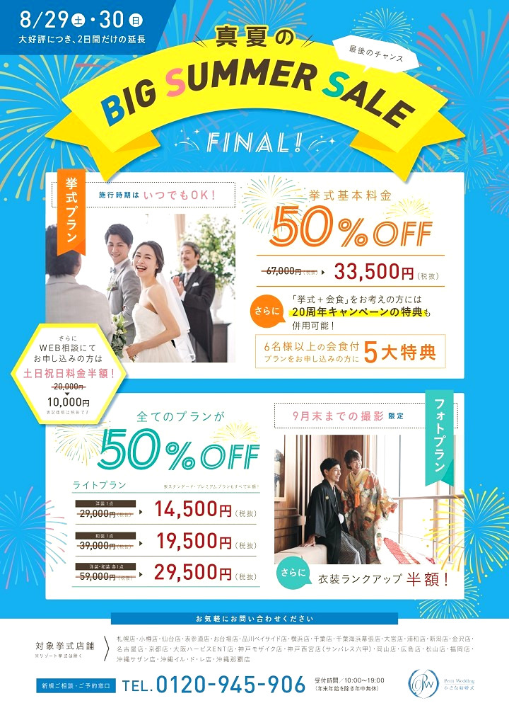 緊急追加!8月29日・30日サマーBIGキャンペーン♫ 挙式、フォトウエディングが半額に!2です。