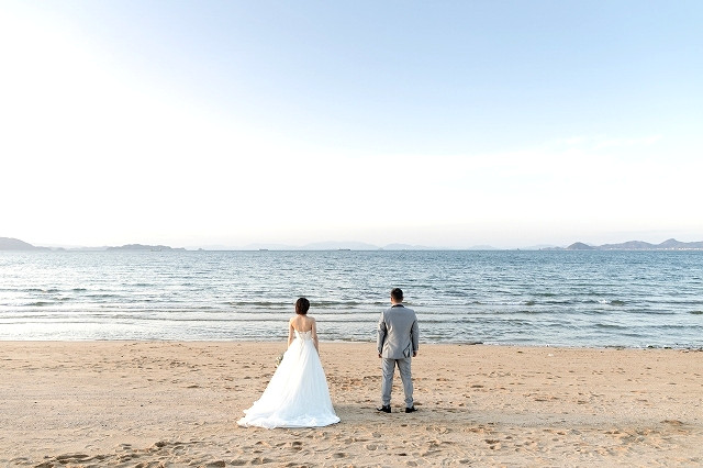 松山のフォトウエディング(WD・CD・和装の白無垢・色打掛も全部)レポート♪ウエディングドレスでビーチフォト!