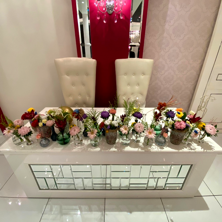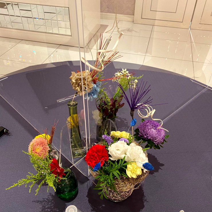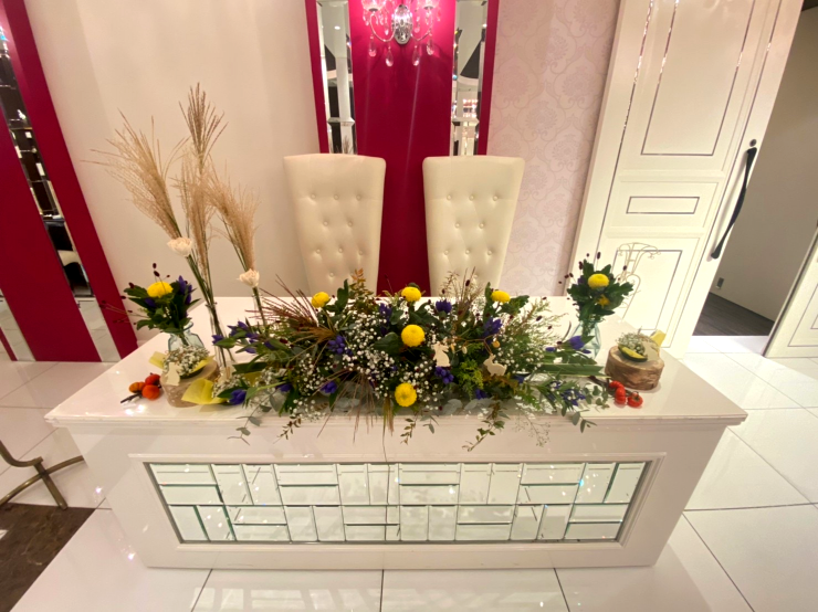 お花の華やかさを目立たせるため、テーブルクロスはシンプルなネイビーにしています