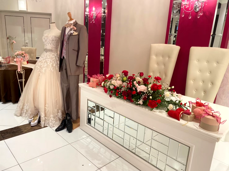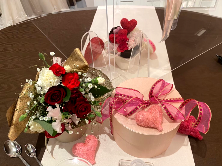 赤と白を基調としたお花、ハートとプレゼントボックスのオブジェで