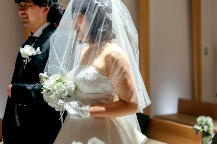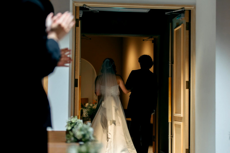 ベールダウンやバージンロードを親御さまと一緒に歩いているショット