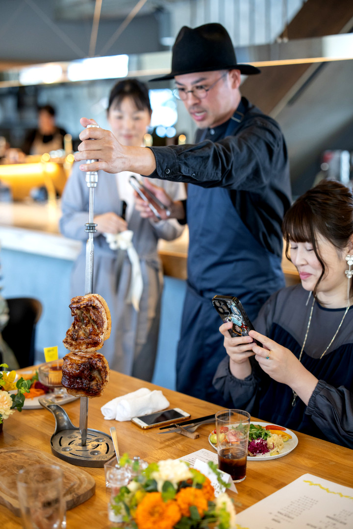 シュラスコのコース料理で、お肉入刀が人気イベントです!(ちょっと熱いので注意)