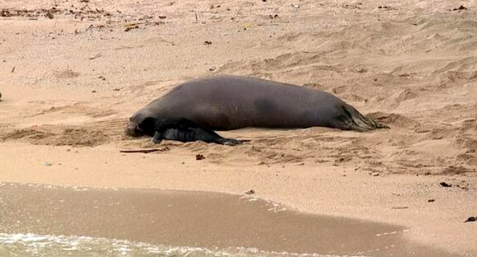 ワイキキのカイマナビーチで5月1日の朝にハワイアン・モンクシール(アザラシ)の赤ちゃんが誕生しました!!