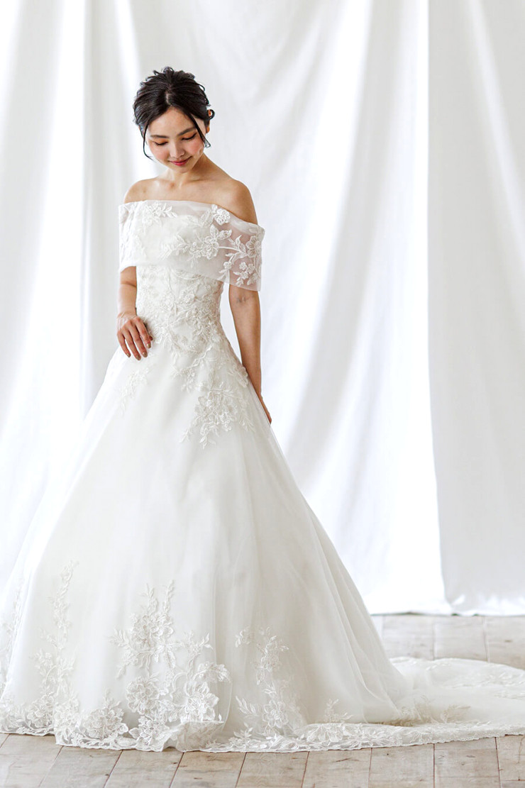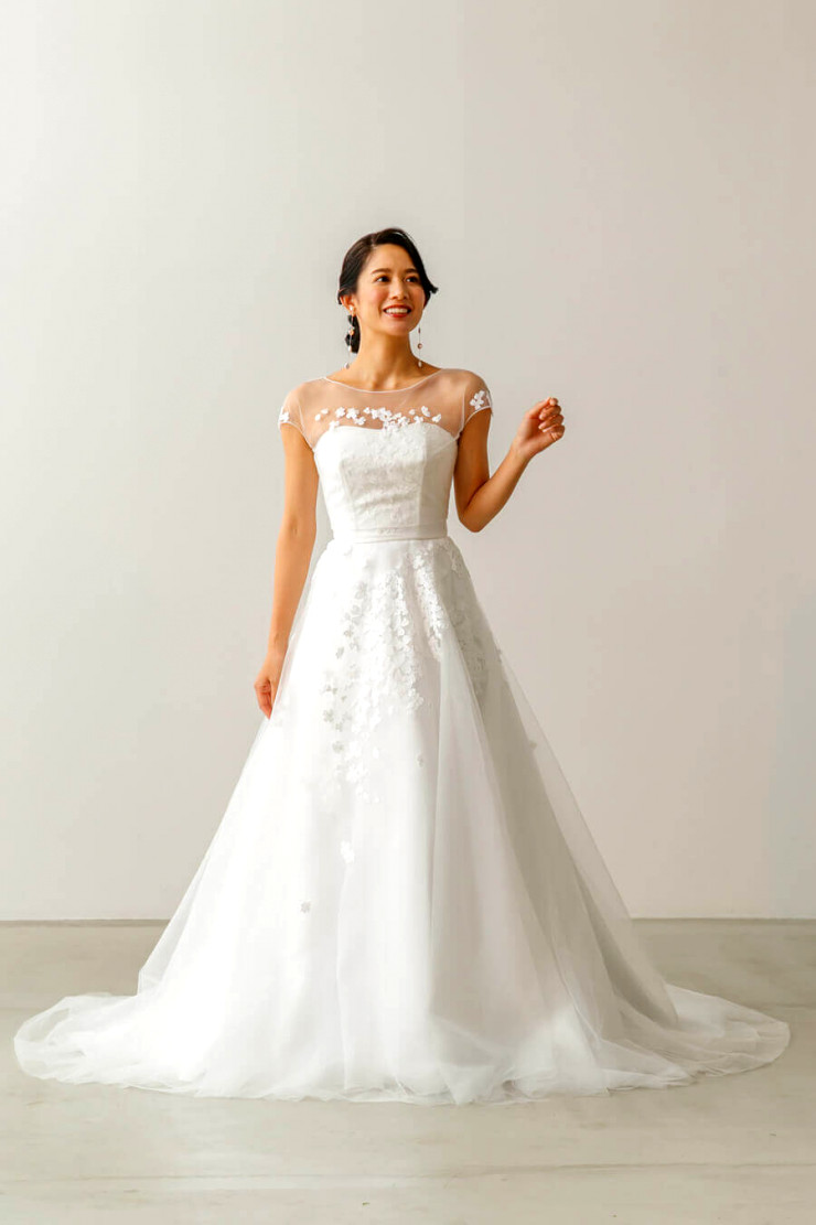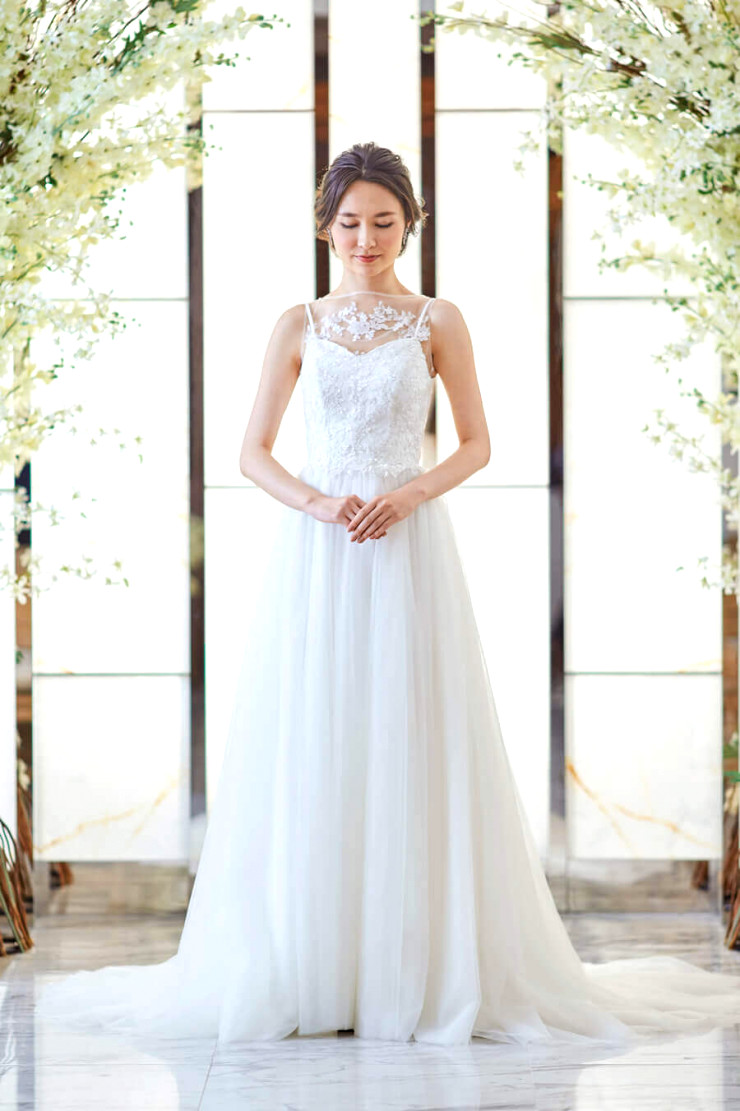 チュールを使用したナチュラルで優しい雰囲気の、控えめAラインドレス。