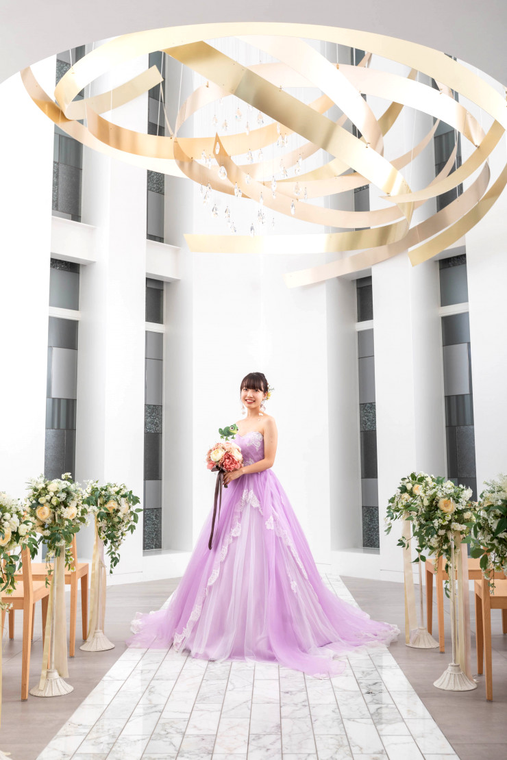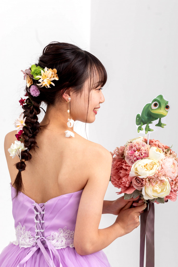 まずは淡いパープルが素敵な【ライラックペタル】というドレスでラプンツェルをイメージしました!