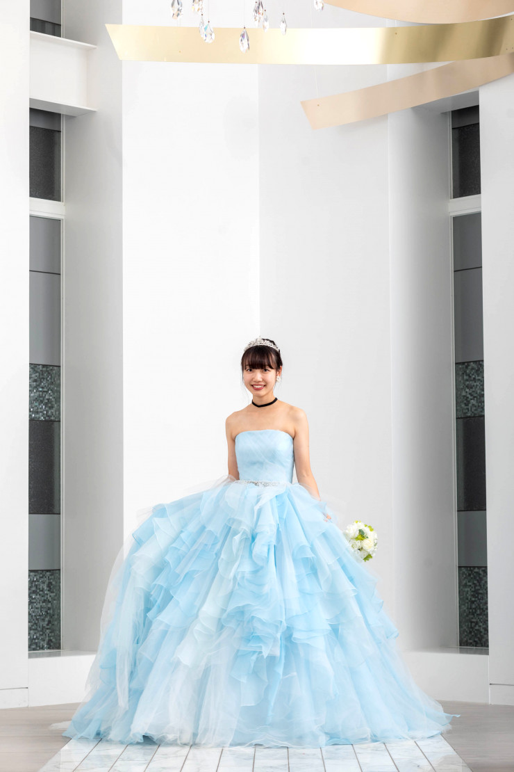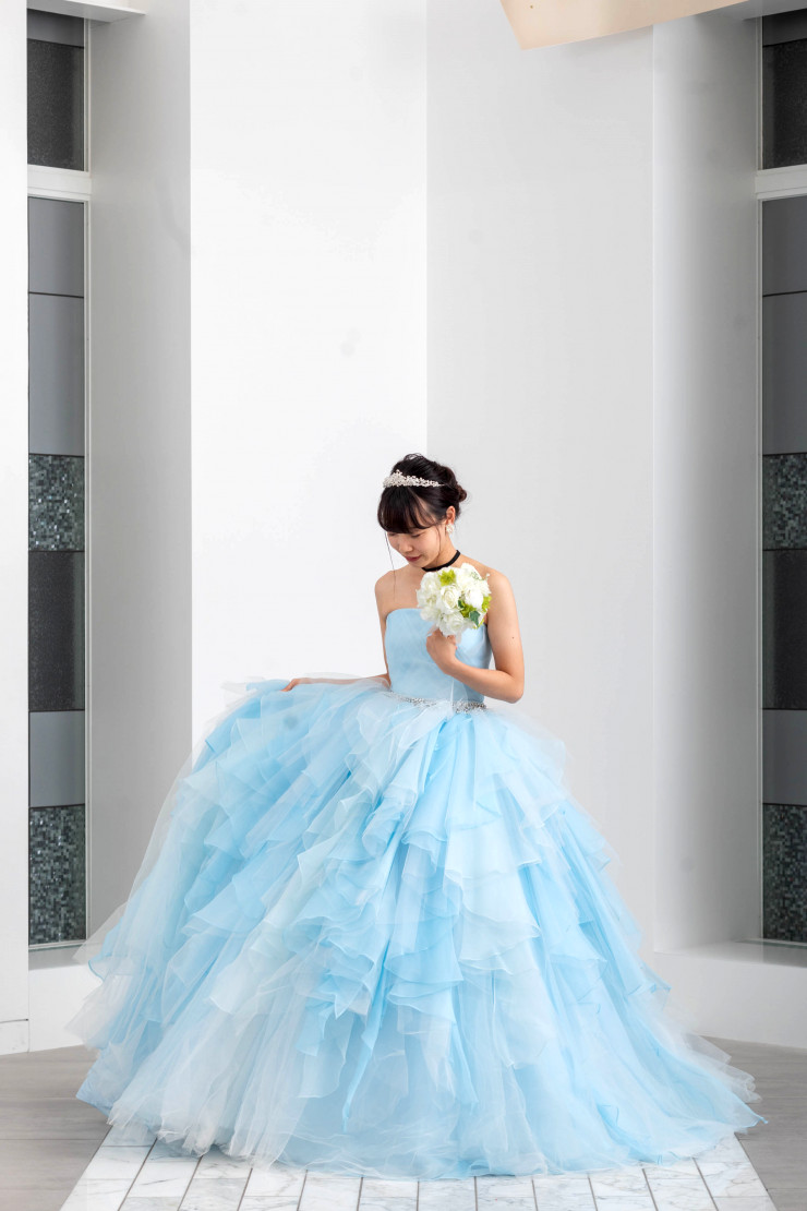 このボリューム感がとってもかわいいドレスですが、なんと上のフリルは取り外しが可能ですので、さわやかでシンプルな水色のドレスとしても着用いただけます🩵