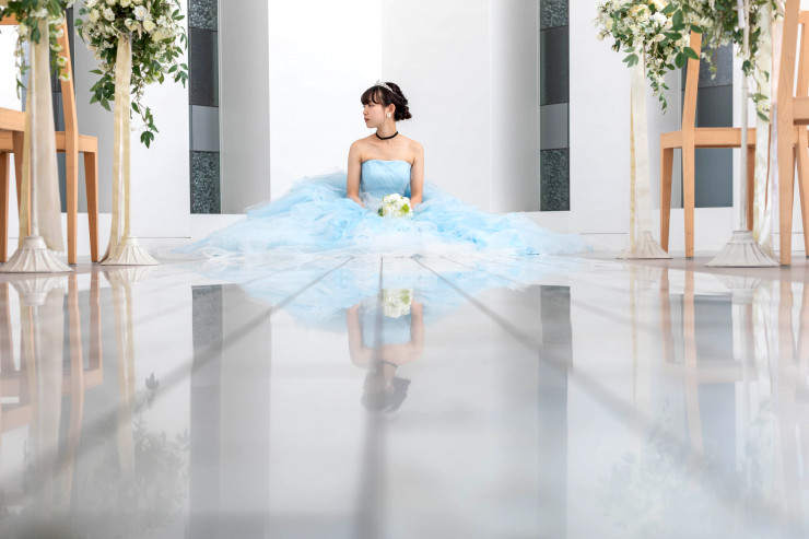白いチャペルと水色のドレスは相性も◎