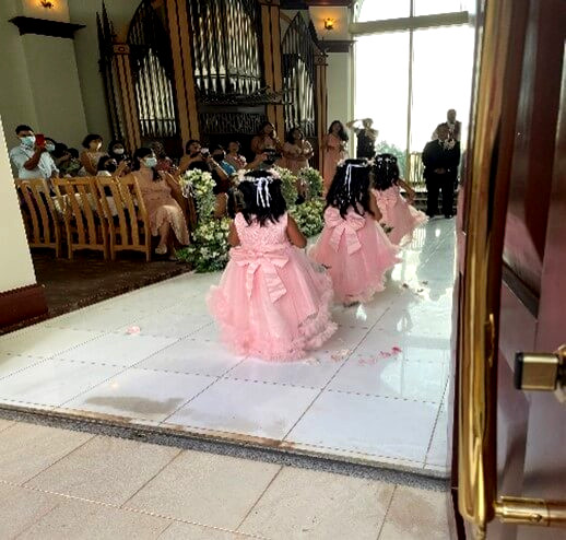 かわいいフラワーガールちゃん達に、バージンロードが清められ