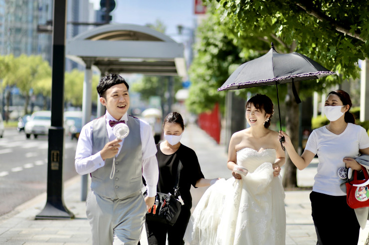 アテンドのスタッフは新郎新婦用の扇風機を常備。夏の撮影の必需品!