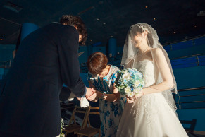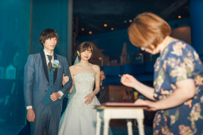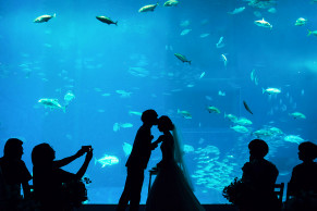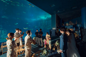 沖縄の海を丸ごと体感できる「美ら海水族館」での貸切ウエディング。ジンベエザメやナンヨウマンタが泳ぐ「黒潮の海」水槽前でのウェディングセレモニーや沖縄の大自然でのロケーションフォトがセットになった、ここでしかない特別な体験をご提供します。