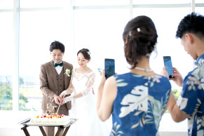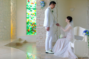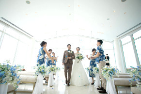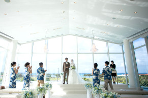おふたりの門出を祝うのは、石垣島の西海岸にある「石垣島ビーチホテルサンシャイン」に併設の、真っ青な海とウォーターガーデンが広がる海外リゾートのようなチャペル。三面ガラス張りの開放的なチャペルからは美しいエメラルドグリーンの海を見渡すことができ、挙式前後にはガーデンやビーチロードなど多彩なロケーションでの撮影を楽しめます。一日一組限定の石垣島ウェディングを贅沢で優雅にお過ごしください。
