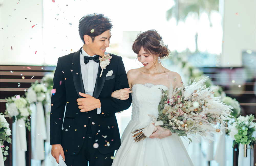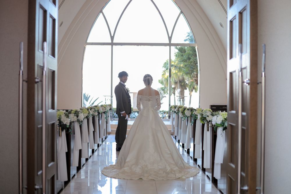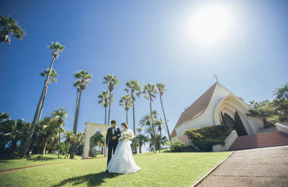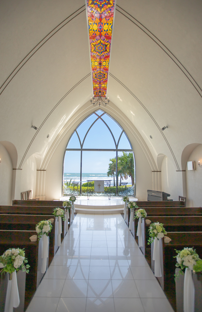 明るい陽射しが降り注ぐ、パームの木々に囲まれた独立型チャペルがおふたりの晴れ舞台。扉を開くとバージンロードの先には、青島の海と空が広がります。どこまでも続く海と空のように、おふたりの未来が祝福に満たされますように。 開放感溢れる美しい景色の中で、感動の挙式が叶います。