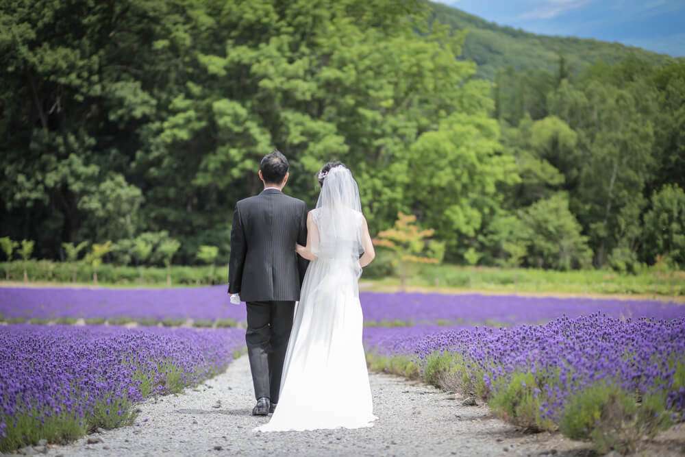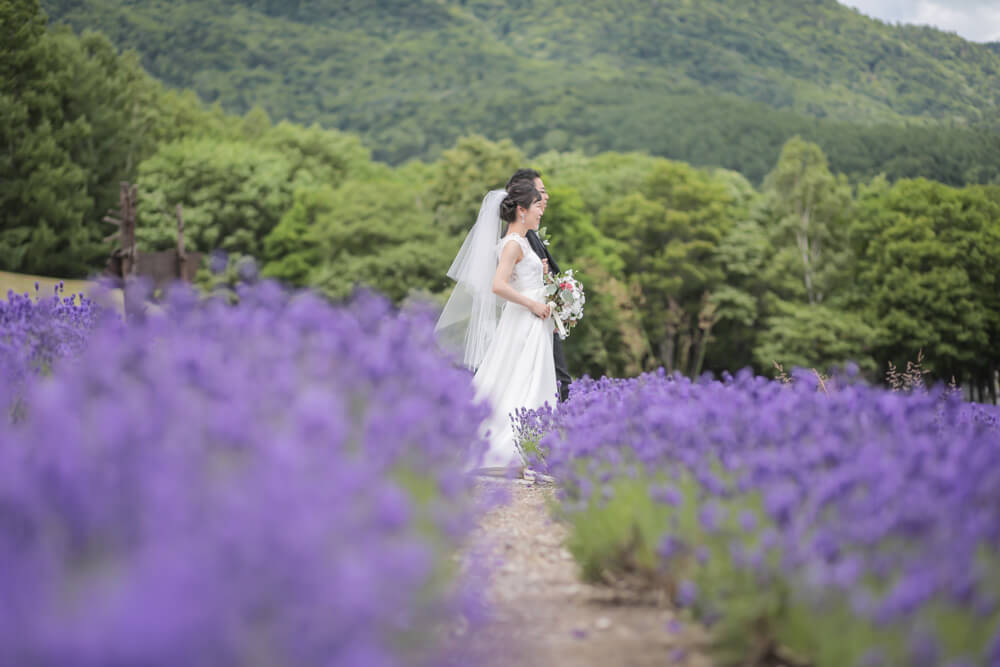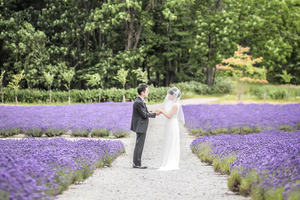 結婚式の舞台は、富良野市最大のラベンダー畑を持ち、別名「ラベンダーの森」とも呼ばれるホテル・ハイランドふらの。 鮮やかな紫色が一面に広がる見事な景色は『ラベンダーの海』とも称され、見頃を迎える7月中旬~下旬には多くの人々を魅了しています。 そんな色彩豊かな大自然の中で誓うウェディングはまさに唯一無二の空間。自然の息吹を全身に感じながらラベンダーの香りに包まれた特別なひと時をお過ごしください。