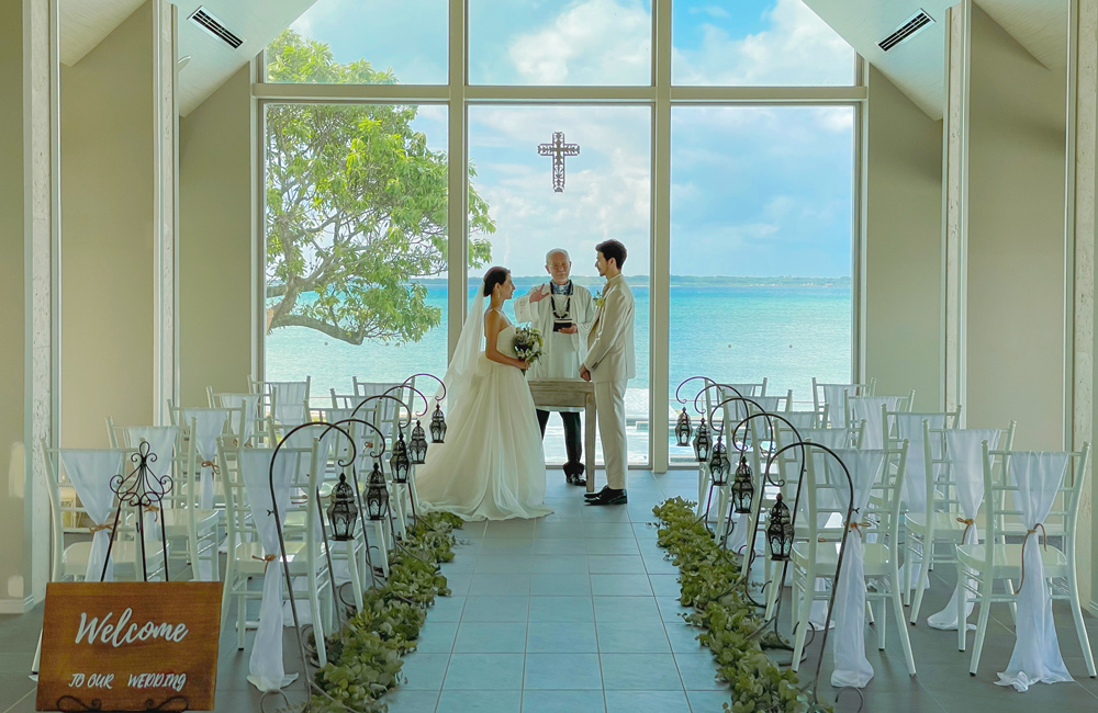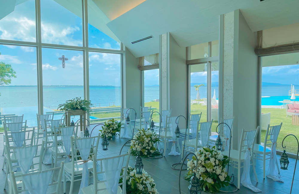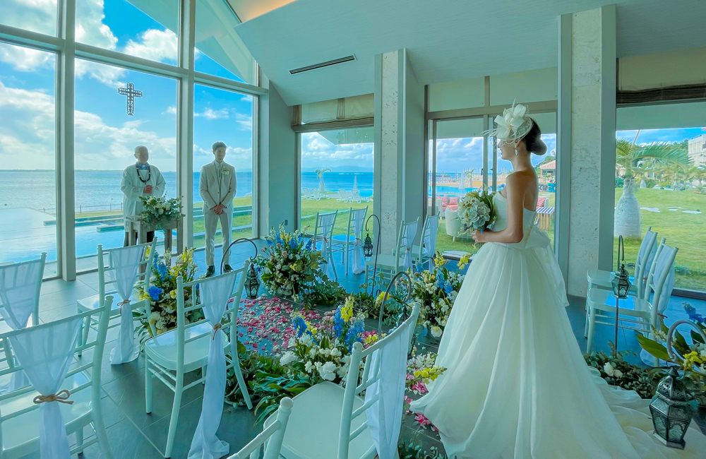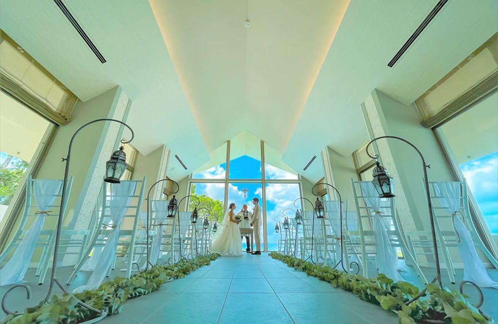 おふたりの門出を祝うのは、石垣島の西海岸にある「石垣島ビーチホテルサンシャイン」に併設の、真っ青な海とウォーターガーデンが広がる海外リゾートのようなチャペル。三面ガラス張りの開放的なチャペルからは美しいエメラルドグリーンの海を見渡すことができ、挙式前後にはガーデンやビーチロードなど多彩なロケーションでの撮影を楽しめます。一日一組限定の石垣島ウェディングを贅沢で優雅にお過ごしください。