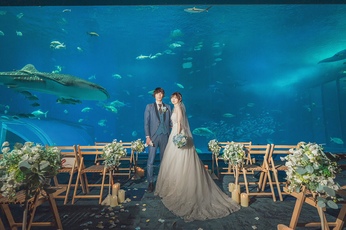 沖縄美ら海水族館で特別な結婚式を。海の生き物に囲まれ、幻想的で他にはない空間の中で誓いを交わすひととき。家族やゲストも驚きと笑顔で見守り、忘れられない思い出が刻まれる、唯一無二のウェディングとなりました。