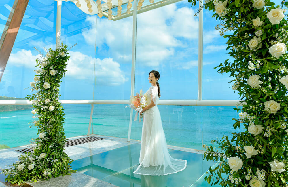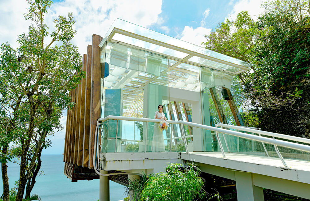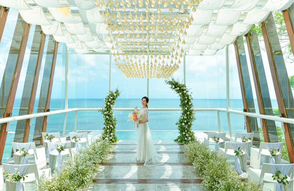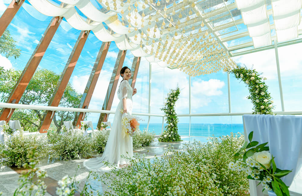 アナンタラ・バリ・ウルワツ・リゾート&スパは、崖の上にたたずむバリならではの神秘リゾート。ラグジュアリーなホテルが競ってオープンを続けるウンガサンのクリフトップに建ちます。そして結婚式の舞台である「デワ・デウィ・チャペル」は、バリ島にある数々のオーシャンフロントチャペルの中でも、群を抜いた海の広さと美しさを臨むことのできる、全面ガラス張りのオーシャンフロントチャペル!美しく真っ青なウルワツの海を180度一望できるその絶景は、バリ島ウェディングならではです。