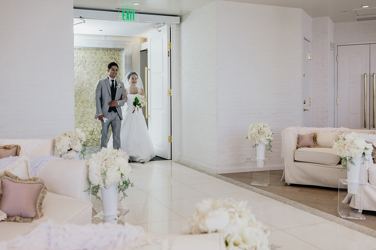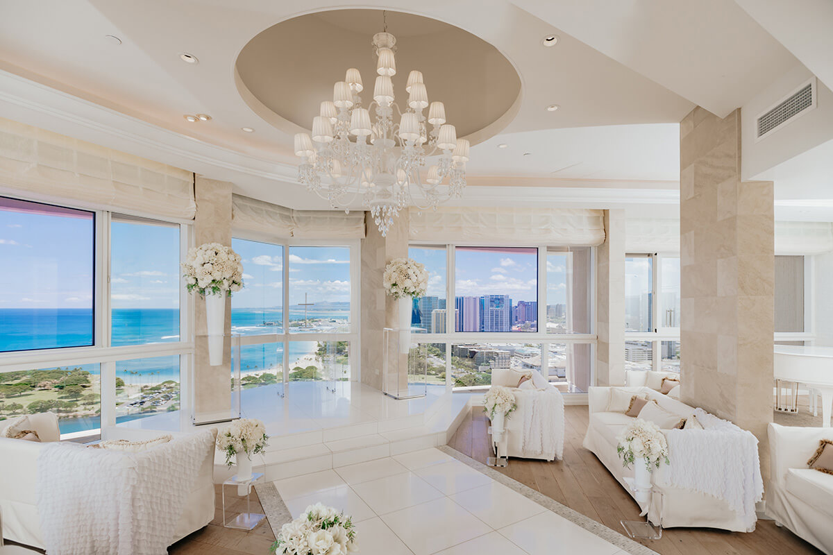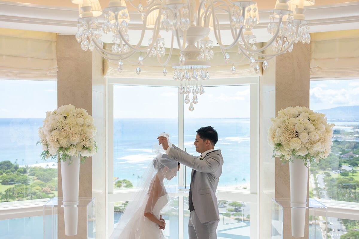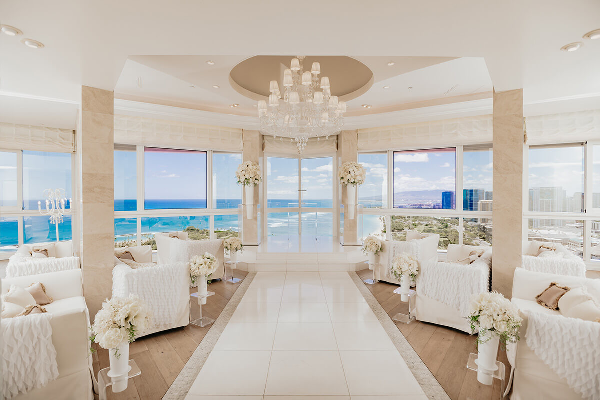 ハワイ語で“喜びの空”を表す「ラニレア(Lani Le'a) チャペル」は、プリンスワイキキの最上階にあります。ハワイの空と海が溶け合う水平線を眺めるのに何も遮るものはありません。感動的な景色の中で交わす誓いは忘れられないひとときに。挙式後はチャペルに隣接するフォトジェニックなピクチャーラウンジでふたりだけの、そして大切な家族や友人との撮影もお楽しみいただけます。