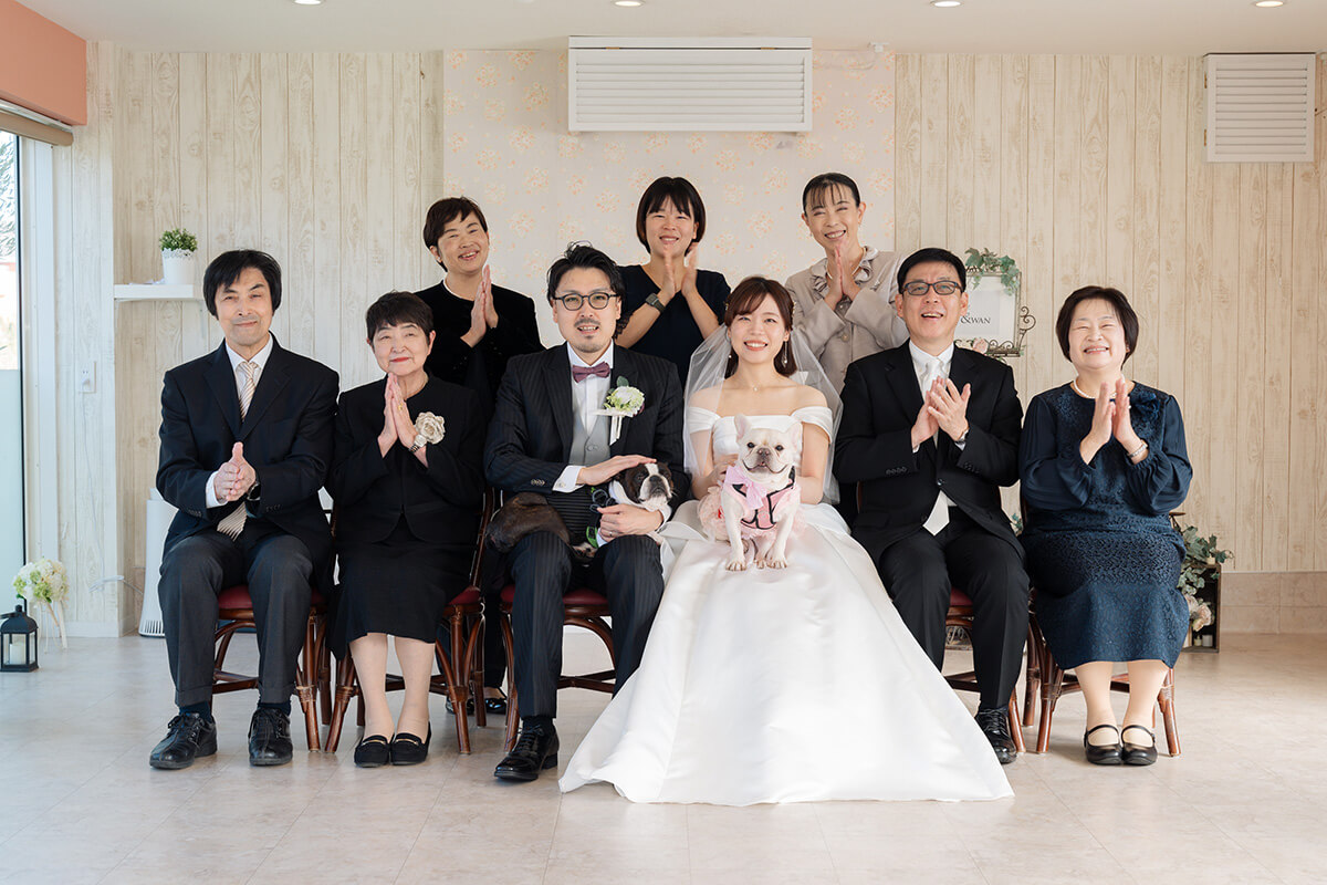リングドッグとして愛犬も参加したおふたりの結婚式。誓いのキスや証人の場面にもそっと寄り添い、そのまま愛犬と一緒に会食できるレストランで、家族みんなで思い出を刻みました。大切な存在と過ごす温かい時間が、ふたりの特別な一日をより輝かせました。