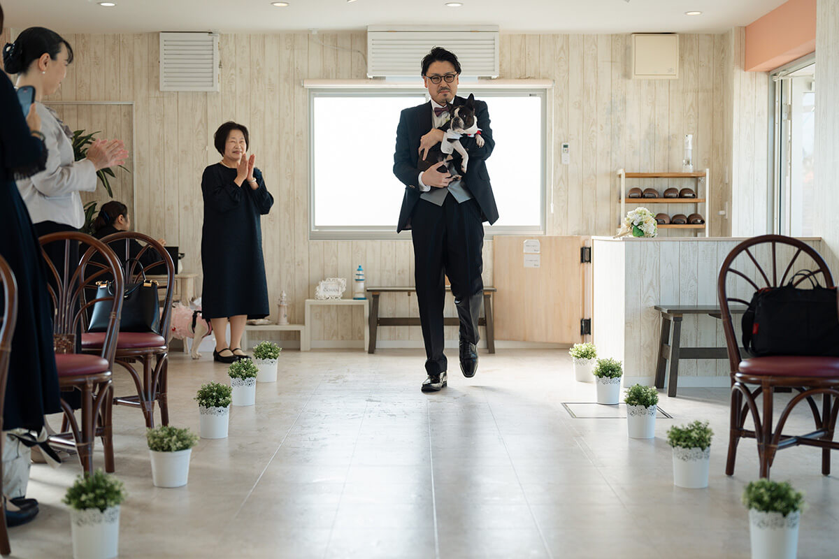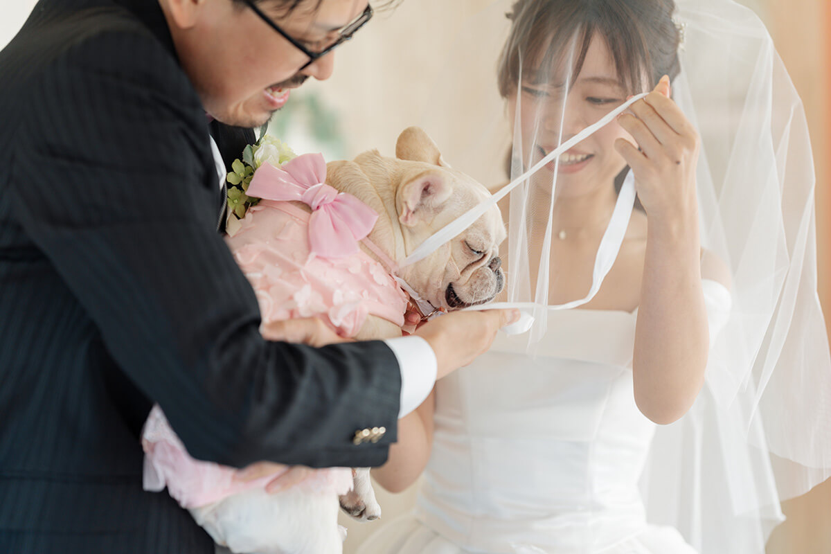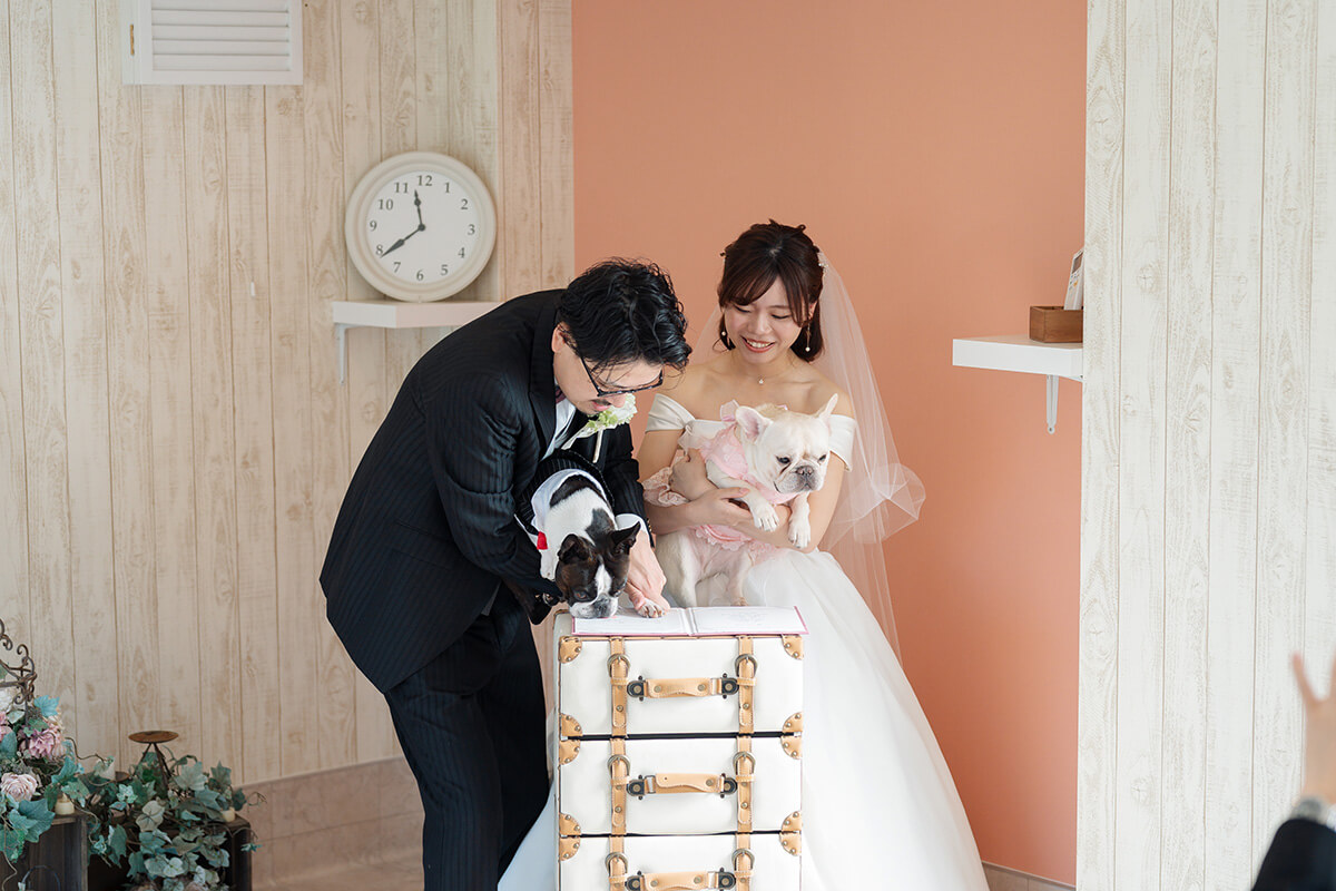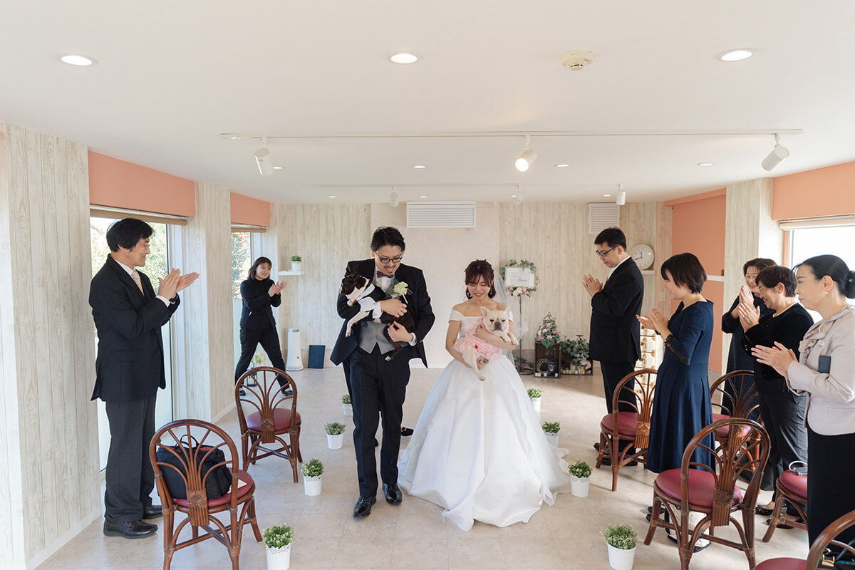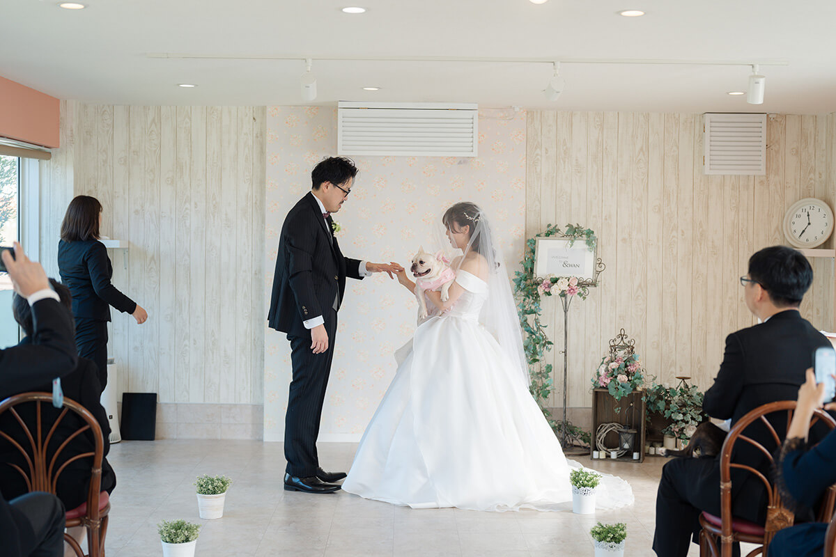 リングドッグとして愛犬も参加したおふたりの結婚式。誓いのキスや証人の場面にもそっと寄り添い、そのまま愛犬と一緒に会食できるレストランで、家族みんなで思い出を刻みました。大切な存在と過ごす温かい時間が、ふたりの特別な一日をより輝かせました。