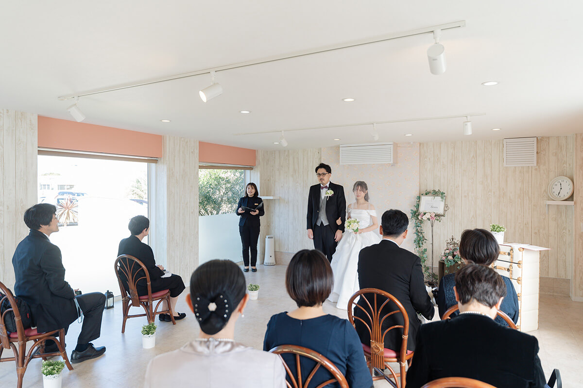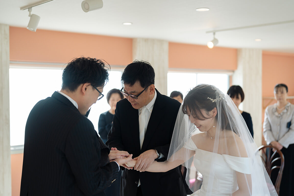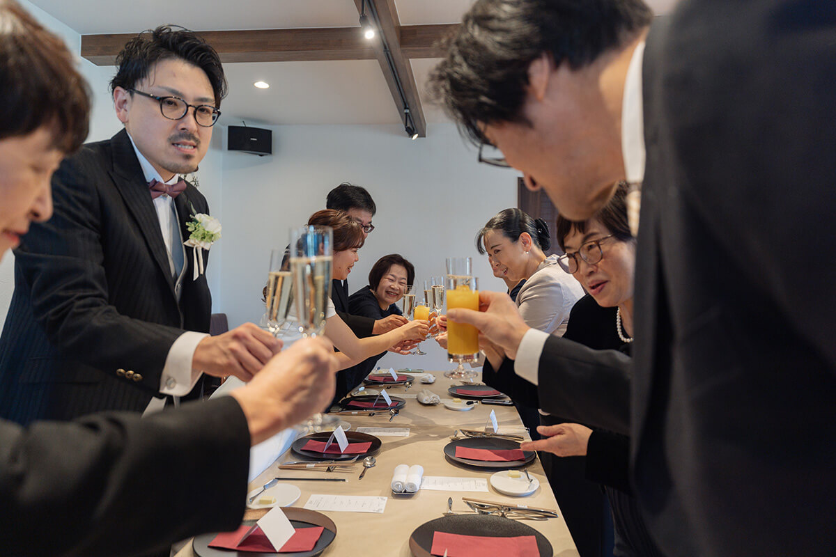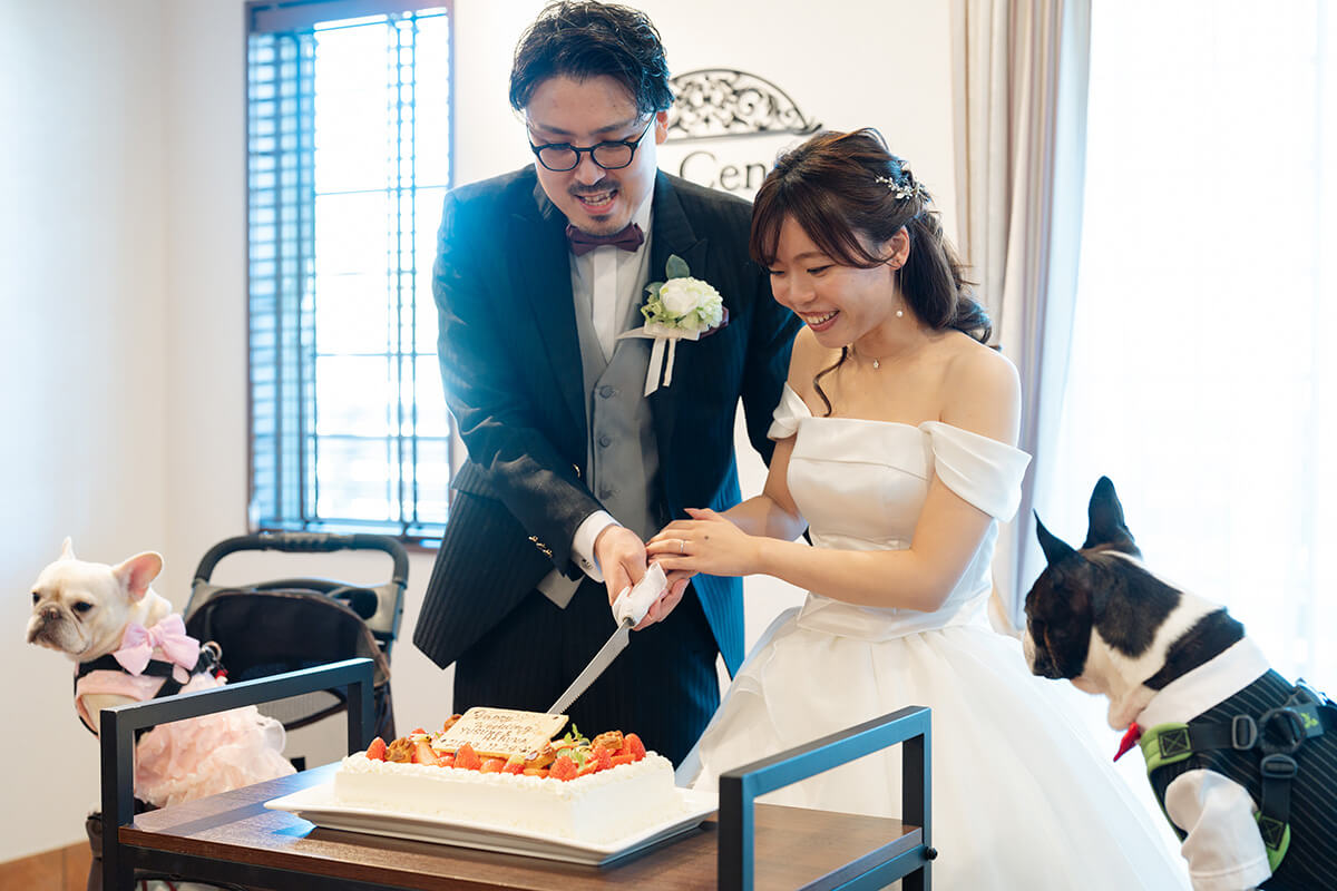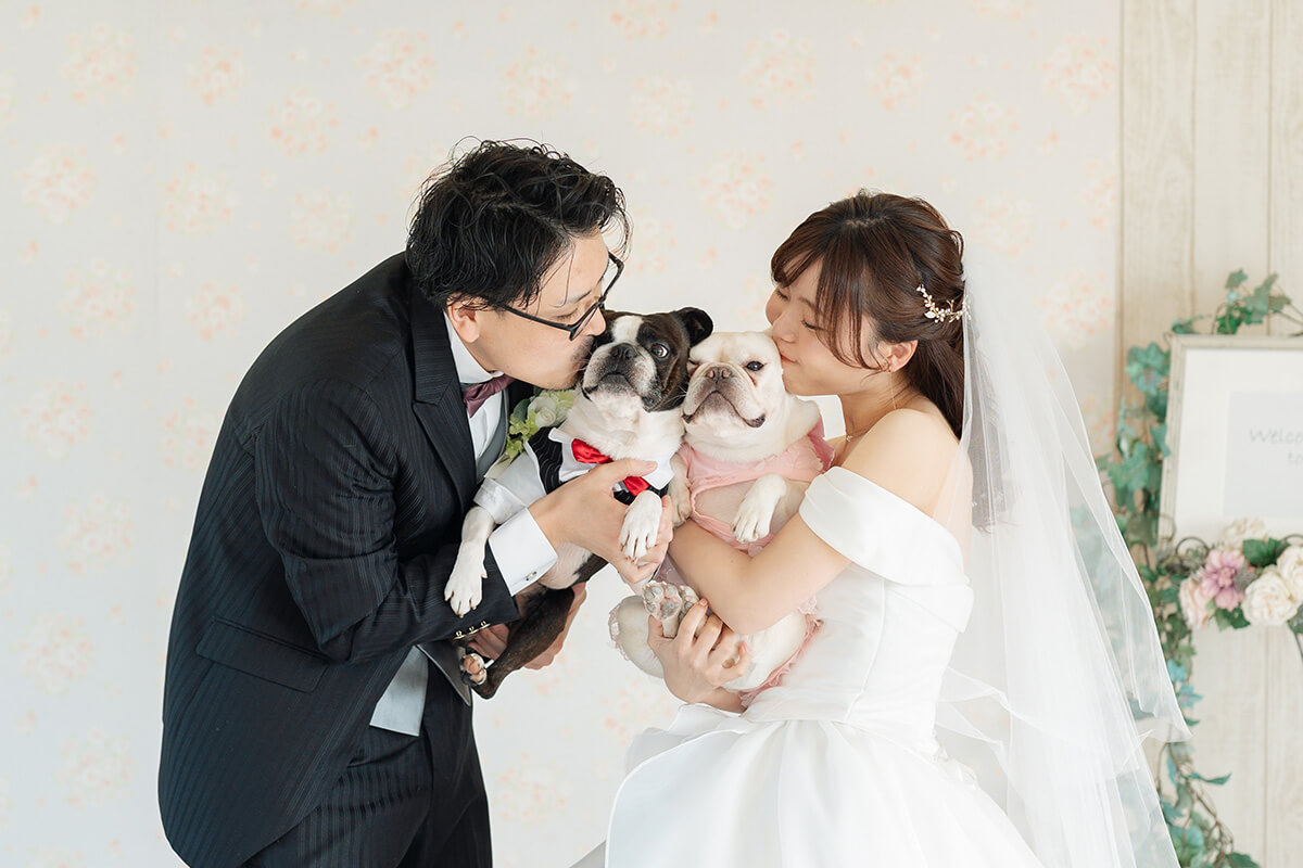 リングドッグとして愛犬も参加したおふたりの結婚式。誓いのキスや証人の場面にもそっと寄り添い、そのまま愛犬と一緒に会食できるレストランで、家族みんなで思い出を刻みました。大切な存在と過ごす温かい時間が、ふたりの特別な一日をより輝かせました。