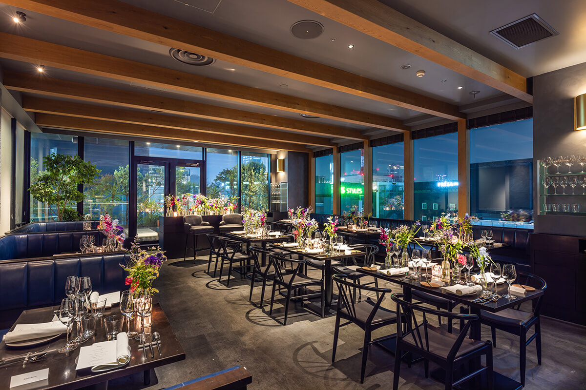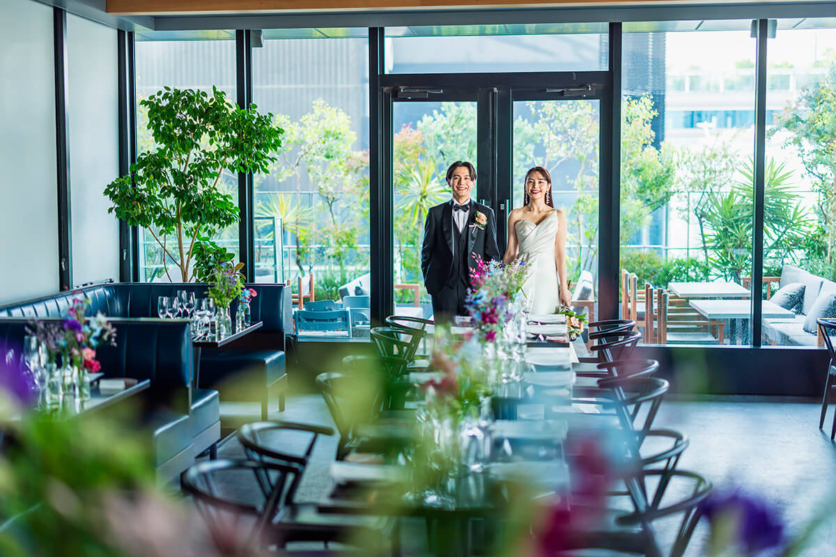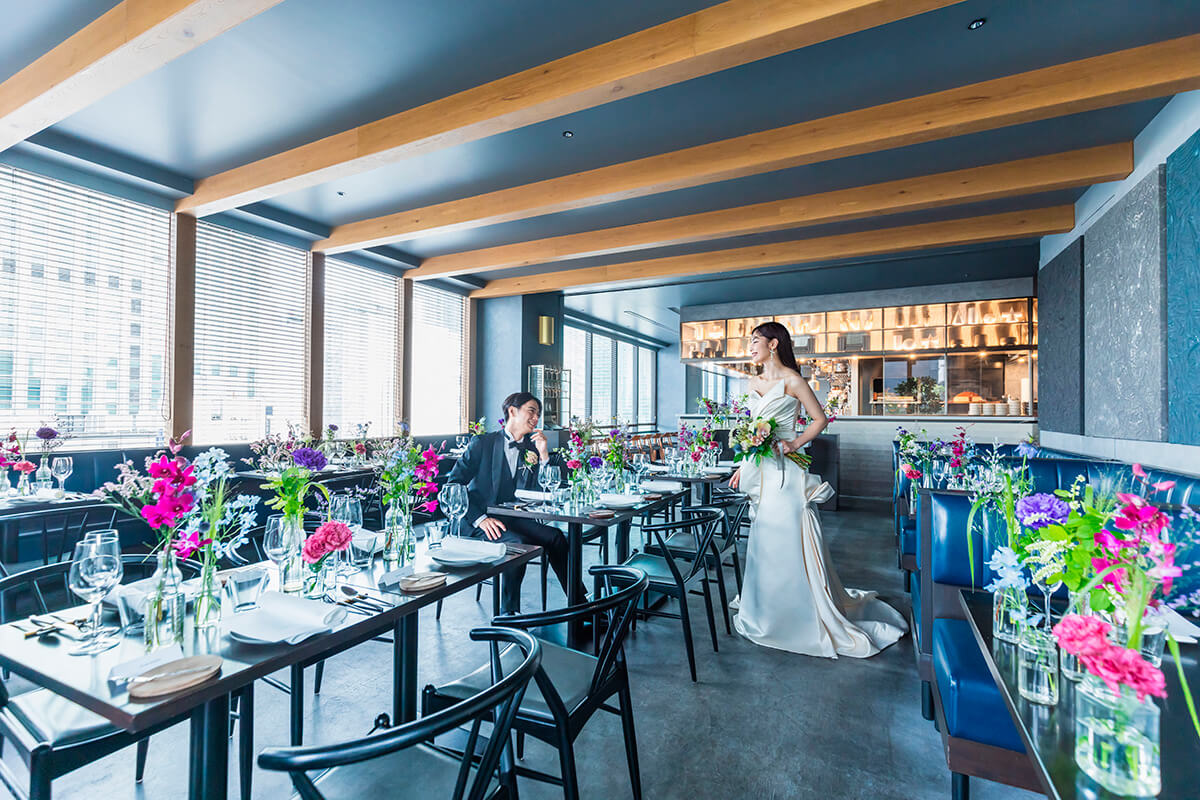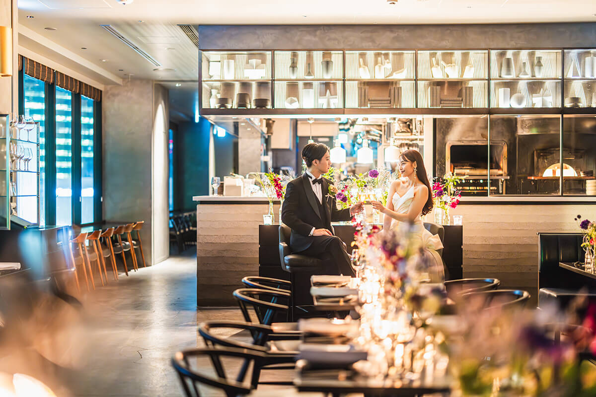 銀座駅より徒歩5分、「ザ ロイヤルパーク キャンバス 銀座8」の最上階14階に位置するルーフトップレストラン「Opuses(オウパセズ)」。 内装から料理、器、アート、そして音楽まで統一した美意識によって生み出される、洗練されたモダンな空間で、1日1組だけのプライベート感あふれるひとときをお過ごしいただけます。ホテル内にはフロントロビーやティーサロンをはじめ、アーティスティックなフォトスポットが多数。写真にこだわるおふたりにもおすすめです。日本のショウルームのような街・銀座で、自由で創造的なウエディングが叶います。