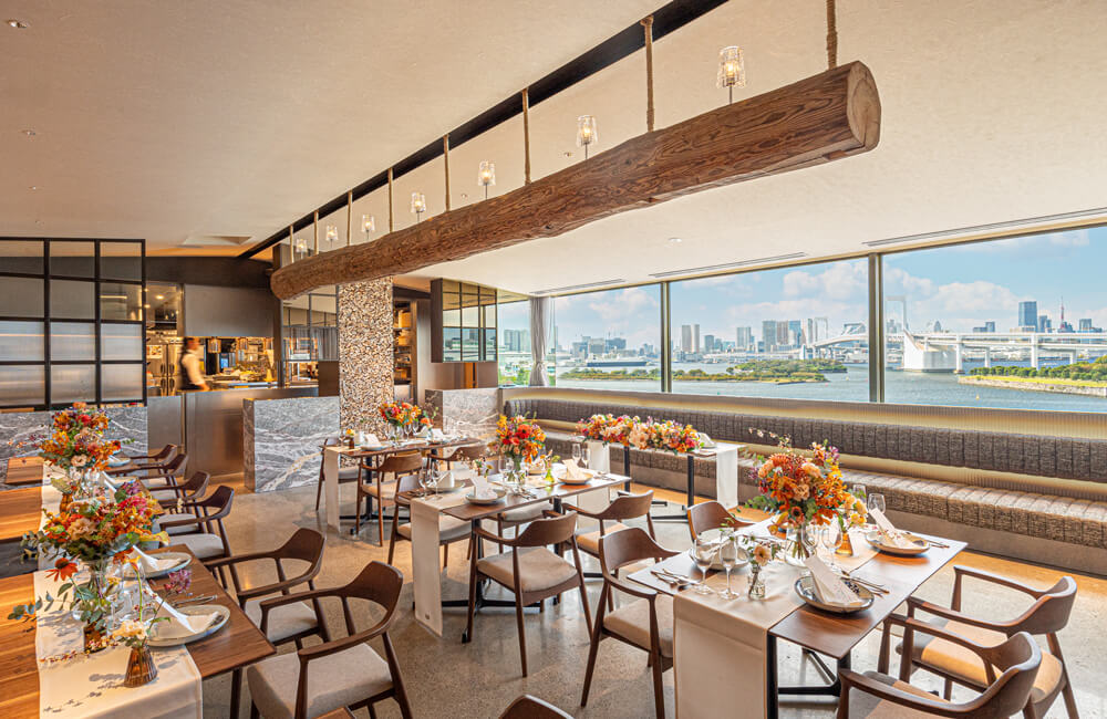 東京湾の壮大な海と夜景を望む絶景のロケーションを誇るお台場に 木の温もりや職人技を五感で感じられる古民家風の癒しの空間を創りました。 日本の古き良き時代にタイムスリップしたような、非日常的な世界へとあなたを誘います。 安全やおいしさにこだわる生産者から直接仕入れた食材を使用。 その魅力を最大限に引き出すためにフレンチの料理人が手間暇をかけて和洋融合の新しい感覚の料理を提供します。