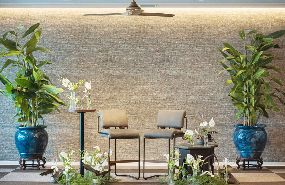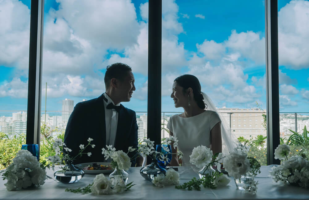 ミッドセンチュリー時代のアメリカンカルチャーから着想を得た内装デザインとインテリア。大きな窓の外には那覇市街地のパノラマが広がります。「琉米文化」が融合した当時の面影を感じながら、木のあたたかみを活かしたバンケット。最大80名様を収容可能なバンケットで大人数でもできたてのフルコースでおふたりの大切なゲストをおもてなしいたします。