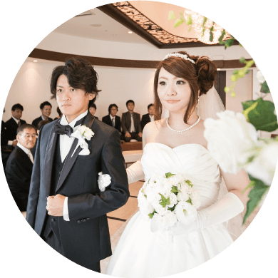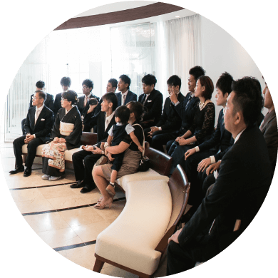 ゲストの皆様は、挙式スタートの30分前に集合(ヘアセットや着物の着付けなどをされる方は、別途、ご来店時間を案内します)。チャペルには5~10分前に着席です。