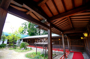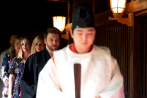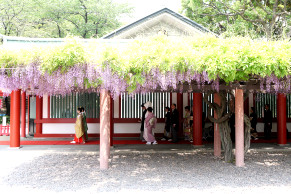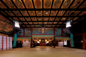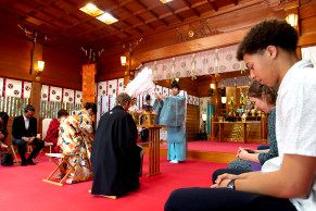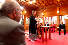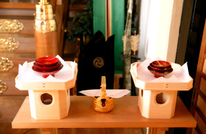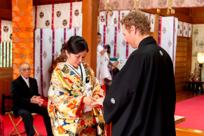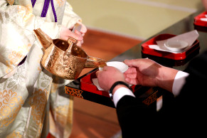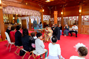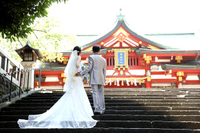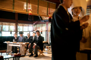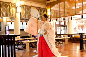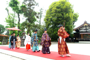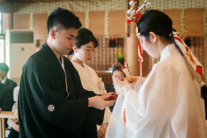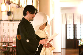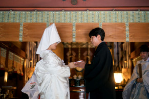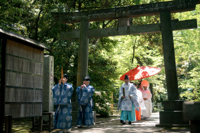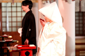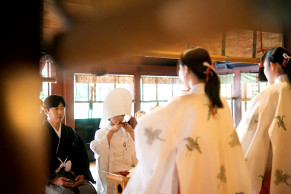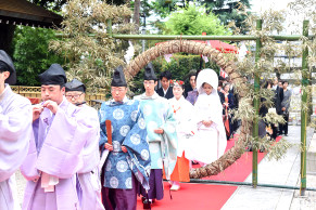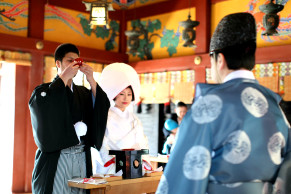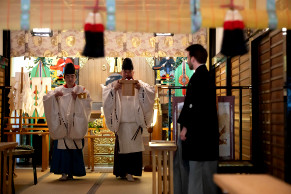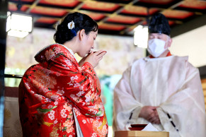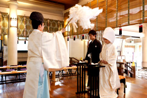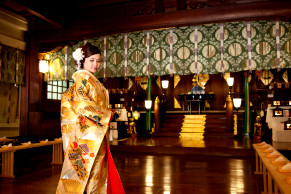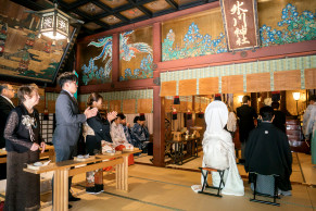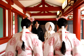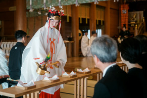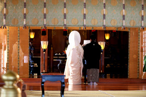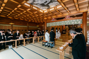 結婚式を執り行う社殿は、ご本殿と参拝者のための拝殿が幣殿で結ばれている「権現造り」という建築様式です。この建物は、日本古来の「木の文化」を象徴し、樹齢250年といわれる木曽檜を使った純木造りとなっています。渡り廊下を進むと、総檜造りの新社殿があります。万葉の浪漫と気品あふれる本格的な神前式、美しい雅楽の調べ、豊栄の舞。本殿のご神前で厳粛に行なわれる挙式は、おふたりの門出を祝福するとともに、おふたりの愛と幸せを末永く結びます。
