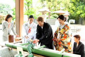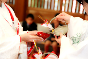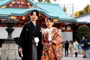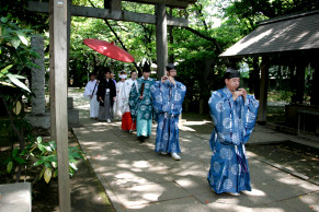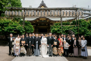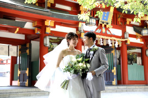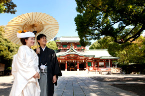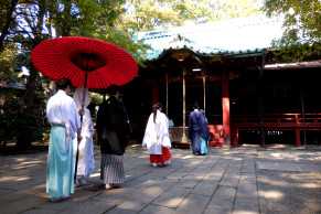 境内に一歩足を踏み入れると豊かな緑がお出迎え。趣のある雰囲気で都会の喧騒を忘れさせてくれます。ここでは素盞嗚尊(すさのおのみこと)、奇稲田姫命(くしいなだひめのみこと)、大己貴命 (おおなむぢのみこと)をおまつりしています。「厄除け」「良縁・縁結び」「家内安全」「商売繁盛」の御神徳があり、多くの人々が参拝におとずれる由緒正しい神社です。「参進」で雅楽の奏でる中、おふたりが本殿へ入場し、挙式の中で行われる神社独自の「御櫛預けの儀」は、女性の分身とも言われる櫛をご新婦からご新郎へ預けることで、新しい生活を二人三脚で営む誓いを立てる神聖な儀式。赤坂の緑深い格式ある神社で、おふたりと参列者の皆さまの心にいつまでも刻まれる本格神前挙式が叶います。