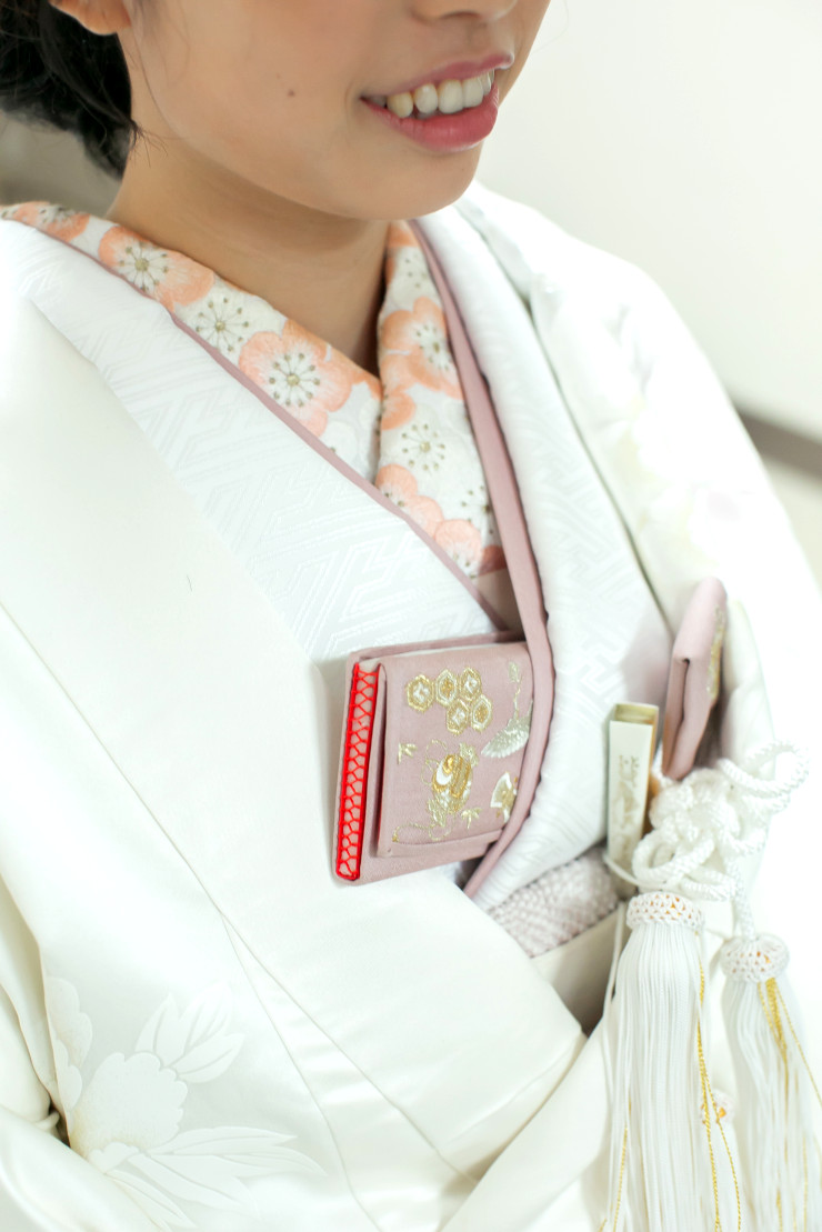 刺繡襟を、小物は薄いピンクの可愛らしい小物を