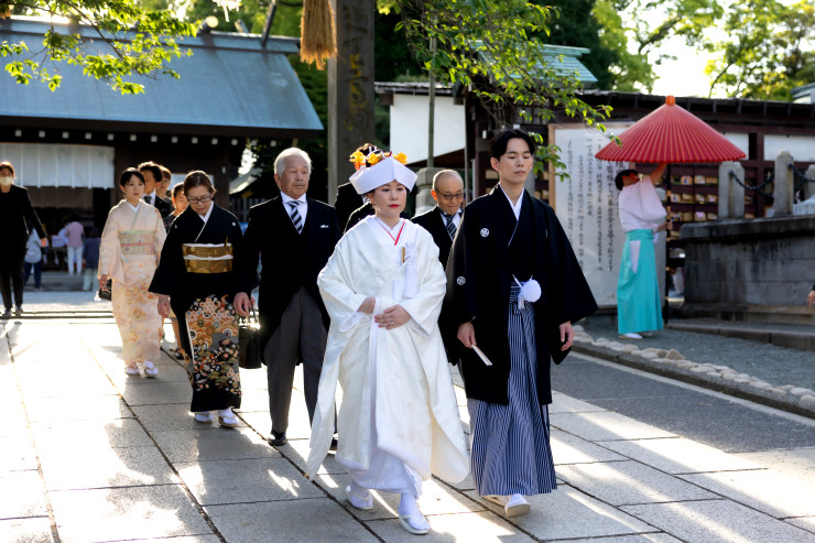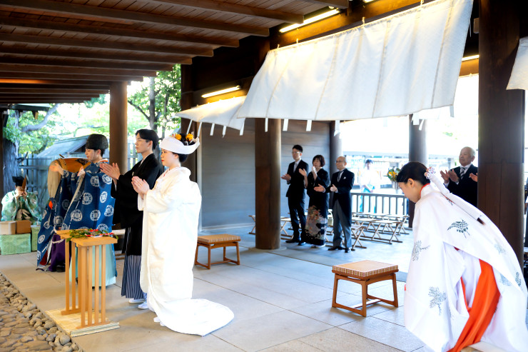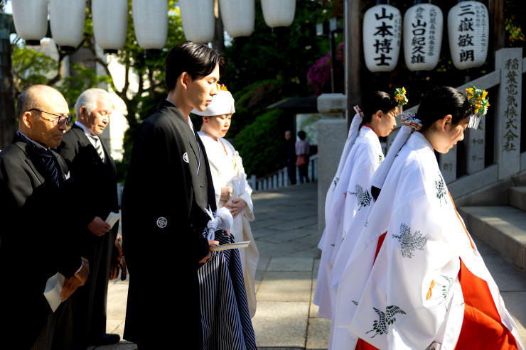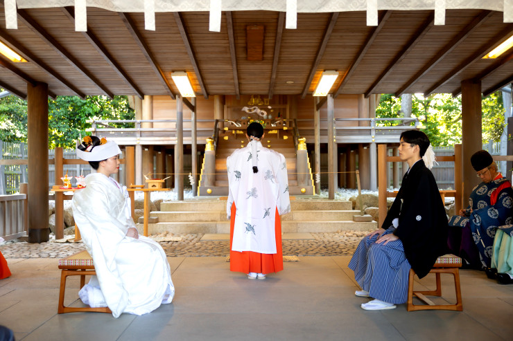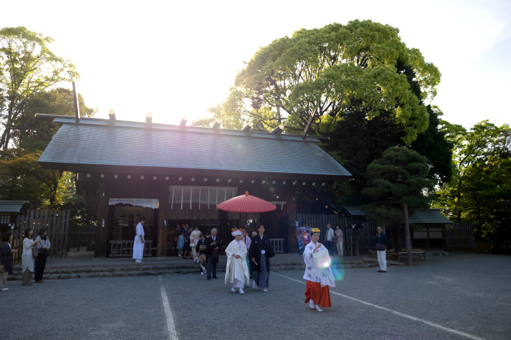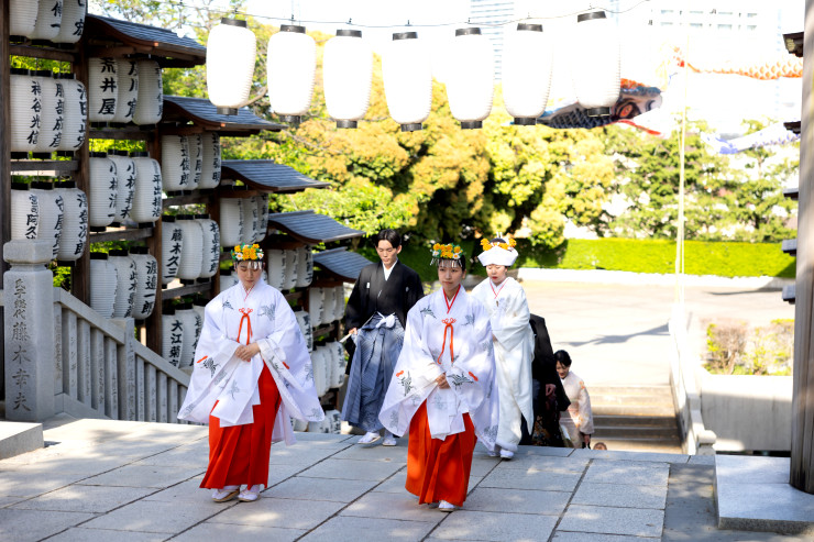 巫女の先導により、新郎新婦と両家親族が殿内より退出します。