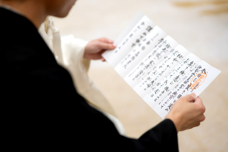 神職が祝詞を奏上し、お二人の結婚を大神さまに奉告し、その行く末永い幸福を祈願します。