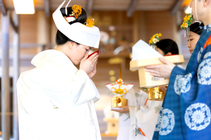 →雄・雌の形をした酒器のお酒を混ぜ合わせ、同じお酒を飲むことで両家一同が親族となることを誓う儀式です。