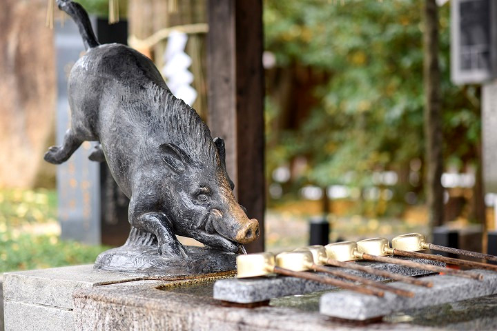 境内には狛犬ではなく、「狛イノシシ」が祀られ、足腰にご利益がある、
