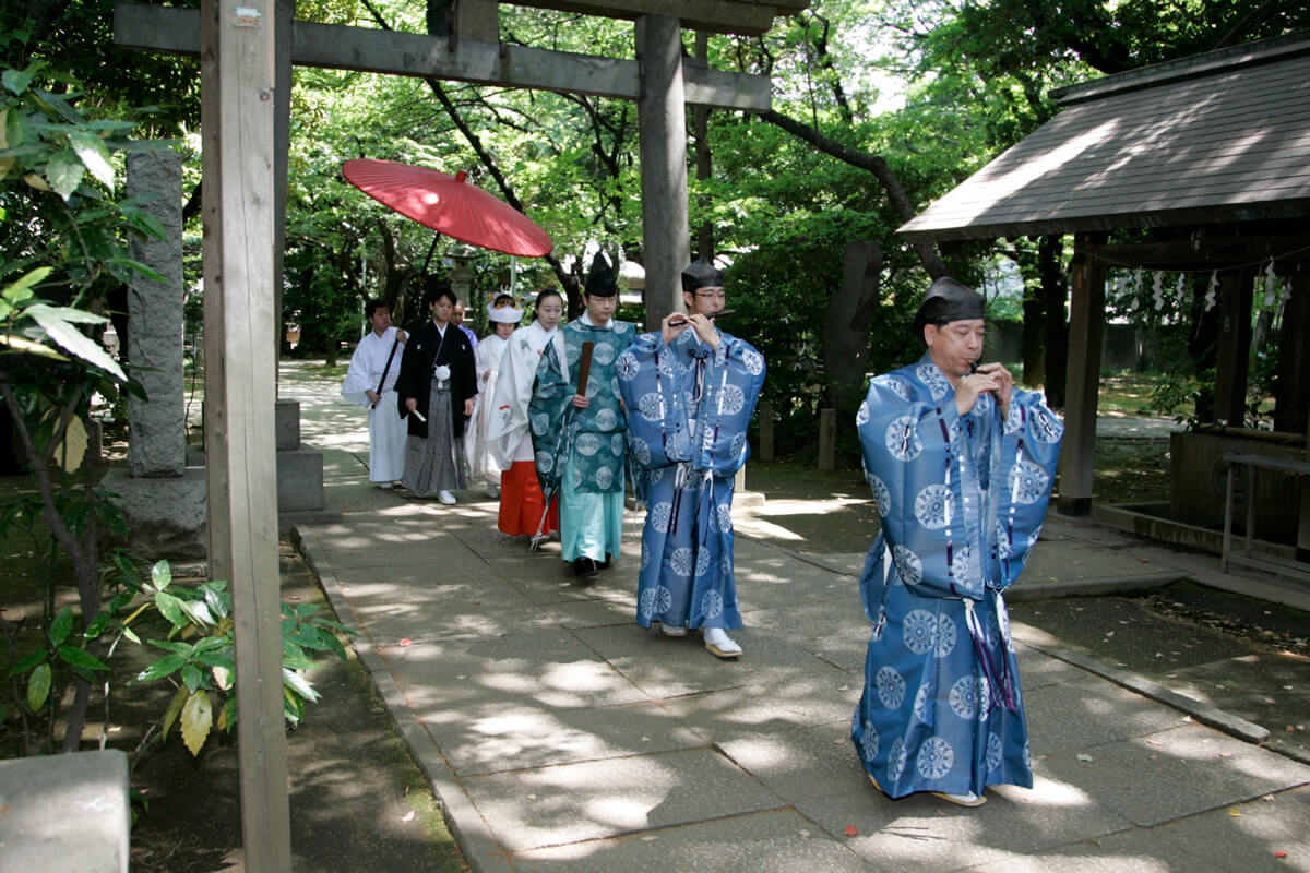 境内に一歩足を踏み入れると豊かな緑がお出迎え。趣のある雰囲気で都会の喧騒を忘れさせてくれます。ここでは素盞嗚尊(すさのおのみこと)、奇稲田姫命(くしいなだひめのみこと)、大己貴命 (おおなむぢのみこと)をおまつりしています。「厄除け」「良縁・縁結び」「家内安全」「商売繁盛」の御神徳があり、多くの人々が参拝におとずれる由緒正しい神社です。「参進」で雅楽の奏でる中、おふたりが本殿へ入場し、挙式の中で行われる神社独自の「御櫛預けの儀」は、女性の分身とも言われる櫛をご新婦からご新郎へ預けることで、新しい生活を二人三脚で営む誓いを立てる神聖な儀式。赤坂の緑深い格式ある神社で、おふたりと参列者の皆さまの心にいつまでも刻まれる本格神前挙式が叶います。