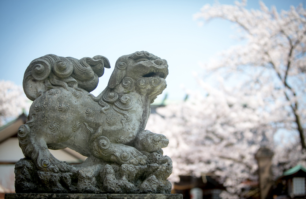 一歩足を踏み入れると、そこは人々が築いてきた歴史ある風情が流れ、初めて訪れてもどこか懐かしい気持ちにさせてくれます。境内には、病を治すと言い伝えられている「酒場の井戸」があり、ご神水として大切にされています。門前には地元の人々から「逆さ獅子」や「逆さ狛犬」と呼ばれ親しまれている「加賀獅子の狛犬」という、めずらしい狛犬がお出迎えしてくれます。神社含め、付近は重要伝統的建造物群保存地区に指定されている、明治初期に建築された金沢の風情が色濃く残る茶屋洋式の町家が建ち並んでおり、ひがし茶屋街でのロケーションも楽しむことができます。