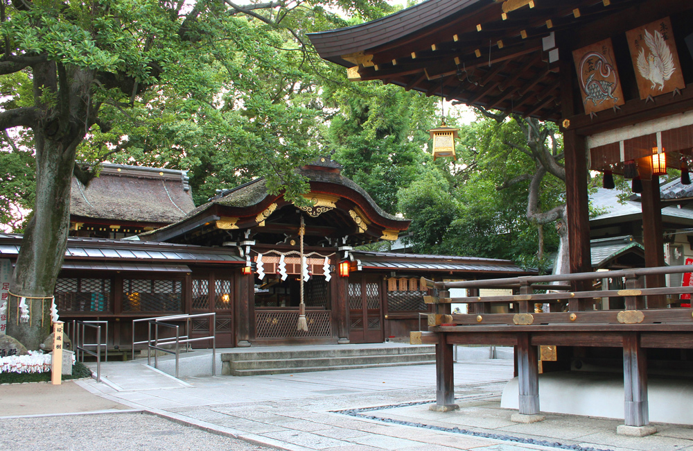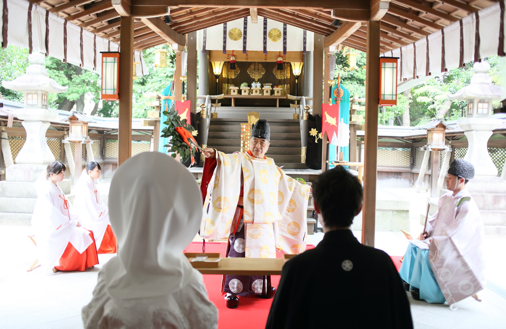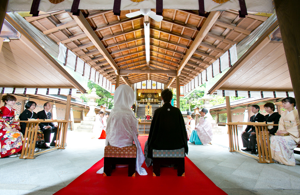 足腰の守護神としても有名で全国各地から参拝に来られるほど。崇敬者により境内の霊猪像(狛いのしし)が奉納されており、狛犬ならぬ「狛いのしし」が門前にてお出迎え。「いのしし神社」とも呼ばれ親しまれています。神社に縁の深い猪は多産であり、子孫繁栄、子育安全の信仰があります。 護王神社の神前挙式は、厳粛かつ雅やかな雰囲気で進められ、打ち響く太鼓の音を聞きながら御神前へ進むと、雅楽の旋律が式場を包みます。おふたりの弥栄(いやさか)を祈る神楽舞では、ひときわ厳粛な雰囲気を味わっていただけます。挙式後は、人力車「寿号」で境内と京都御所周辺の優雅な散策をお楽しみいただけるプランもございます。