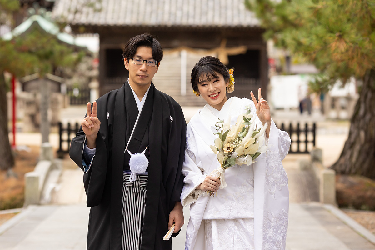 吉備津神社にて、色づく紅葉に包まれながらご家族に見守られて厳かに挙式を執り行いました。鮮やかな秋の景色が、おふたりの誓いをより一層引き立てます。家族の温かな笑顔と祝福に囲まれ、思い出に残る特別な一日となりました。