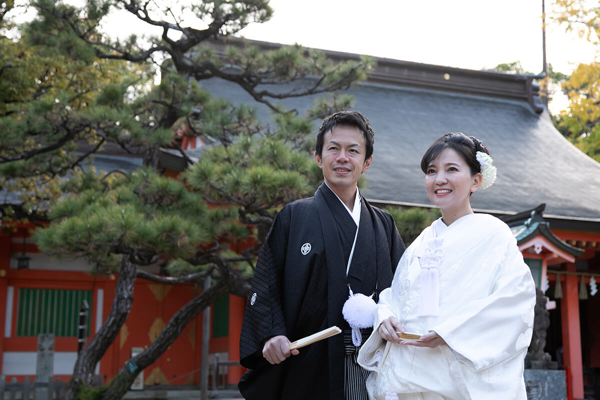歴史ある住吉神社にご家族が集い、厳かでありながら温かい雰囲気に包まれた結婚式に。晴れやかな境内でご両家が自然と笑顔を交わし、静かな時間の中に深い絆が感じられるひとときでした。