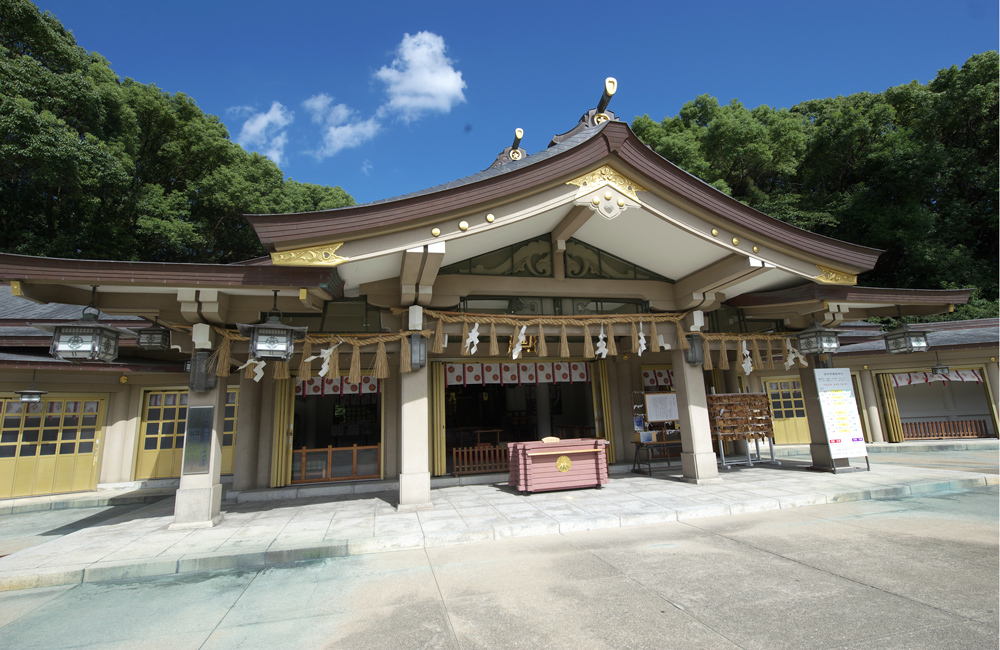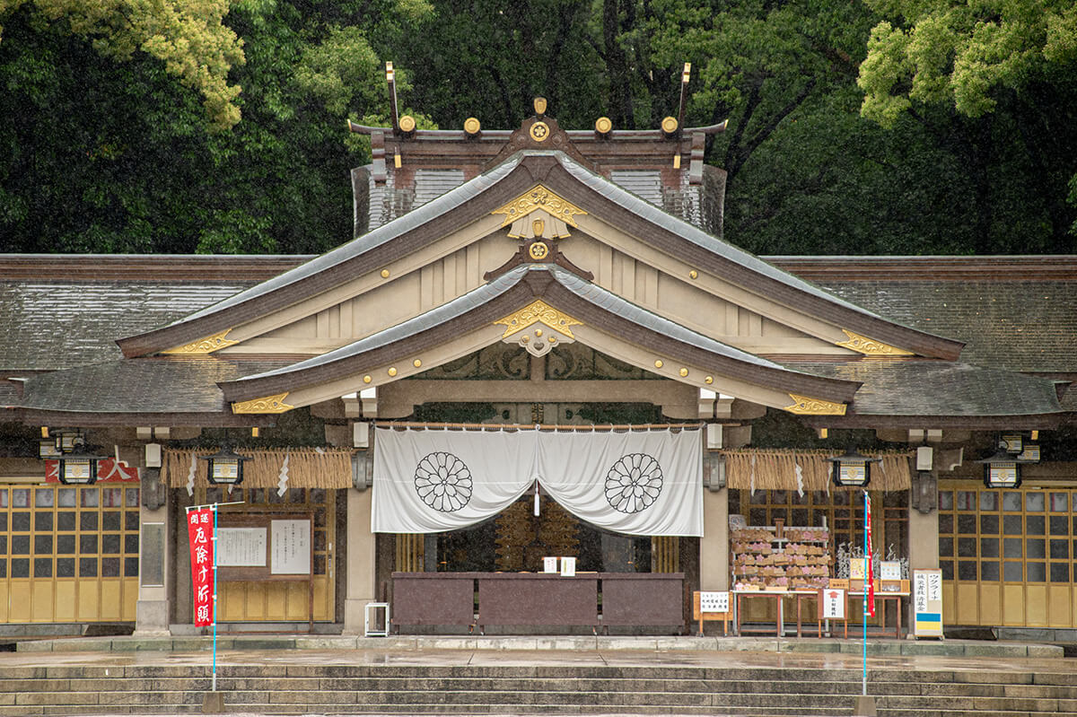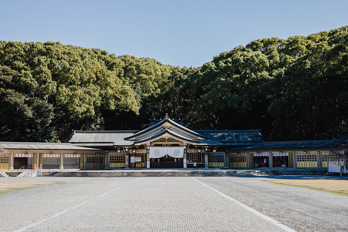 護国神社は明治元年、福岡藩主の黒田長知公をはじめ、県内の旧藩主などが招魂社を設立し、祭祀を行ったのが始まりです。広々とした境内を囲む木々は創建時に県民延べ15万人の勤労奉仕と3000本の献木によるもの。静寂の中にも清々しい雰囲気が境内に広がっています。その中を社殿に向かって列をなし進む「参進」はおふたりの気持ちをいっそう高めてくれます。結婚の儀を行う本殿は半屋内で冷暖房を完備。白を基調にした明るく清らかな空間に神職が奏でる雅楽の生演奏が響き渡る中、静かに厳かに式が執り行われます。結婚式のニーズに合わせて平成18年には控室の建物をリニューアル。広々とお使いいただけるほか、スロープやバリアフリーも各所に対応。幅広い年代のご列席者様も安心してお越しいただけます。
