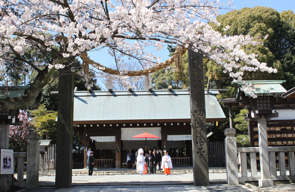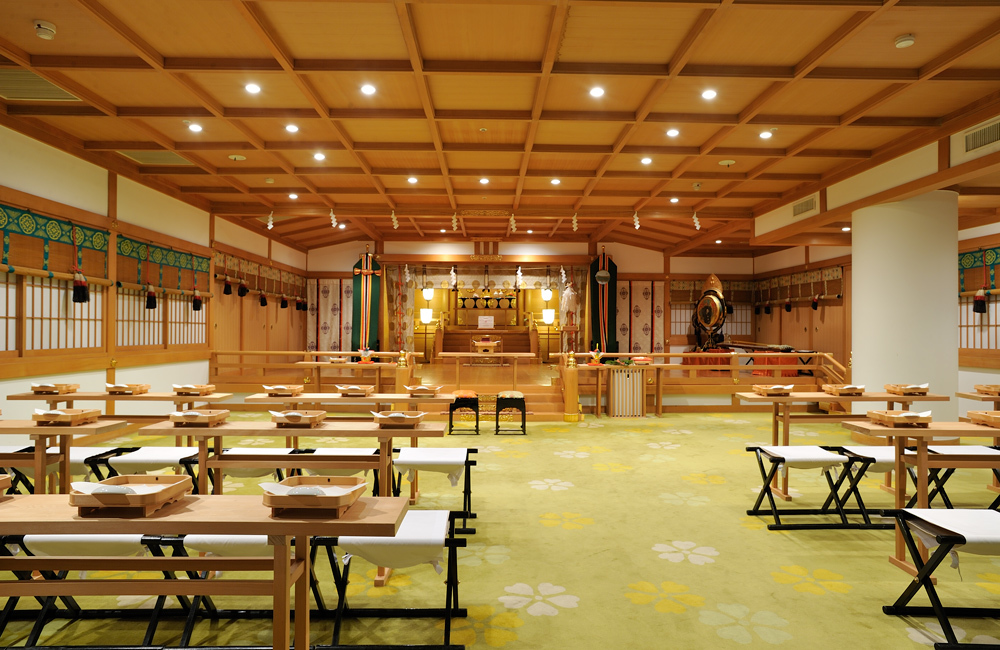 横浜・みなとみらいのビル群が見える丘の上に鎮座する伊勢山皇大神宮は、横浜が貿易の要として開港されるにあたり、国家の鎮護を祈る事を目的に明治3年に創建された、今も参拝する人が絶えない神奈川県の宗社です。御祭神は三重県伊勢市の伊勢神宮の内宮と同じ天照大御神をお祀りし、2020年に鎮座150周年を迎えました。 三重の伊勢神宮内宮の古社殿を賜わり本殿として移築されることになり、2017年には祈祷や結婚式などの儀式を行う神楽殿も完成。 120名様までご参列いただける屋内神殿となりました。雅楽の調べに導かれて本殿へと参進し、注連柱(しめばしら)をくぐると、凛とした空気に高まる気持ち。夕刻より執り行われる『御神火の誓』も伊勢山皇大神宮の特長です。竹筒に入った誘導灯の灯りが石畳の参道を照らし幻想的な雰囲気に包まれます。 桜をはじめ、四季の彩りに包まれながら趣のある格式高い神前式が叶います。