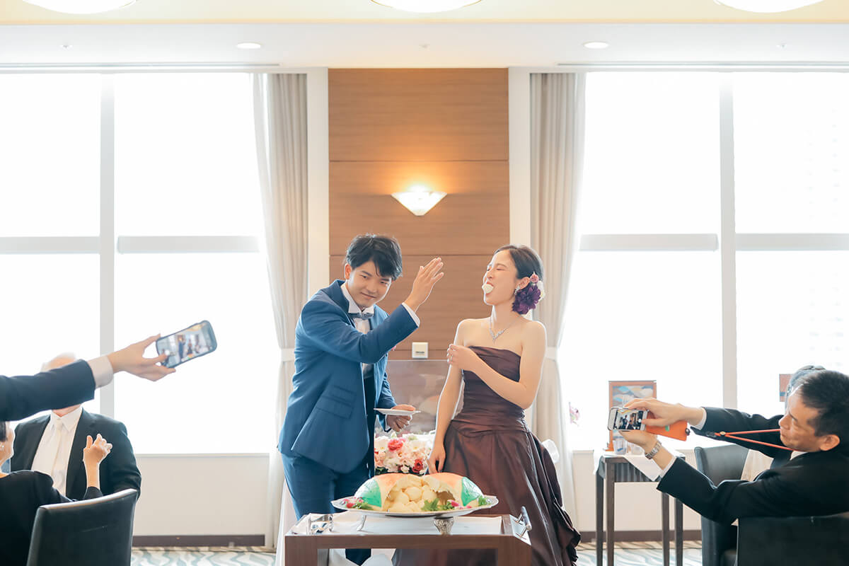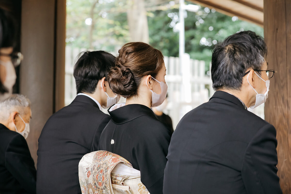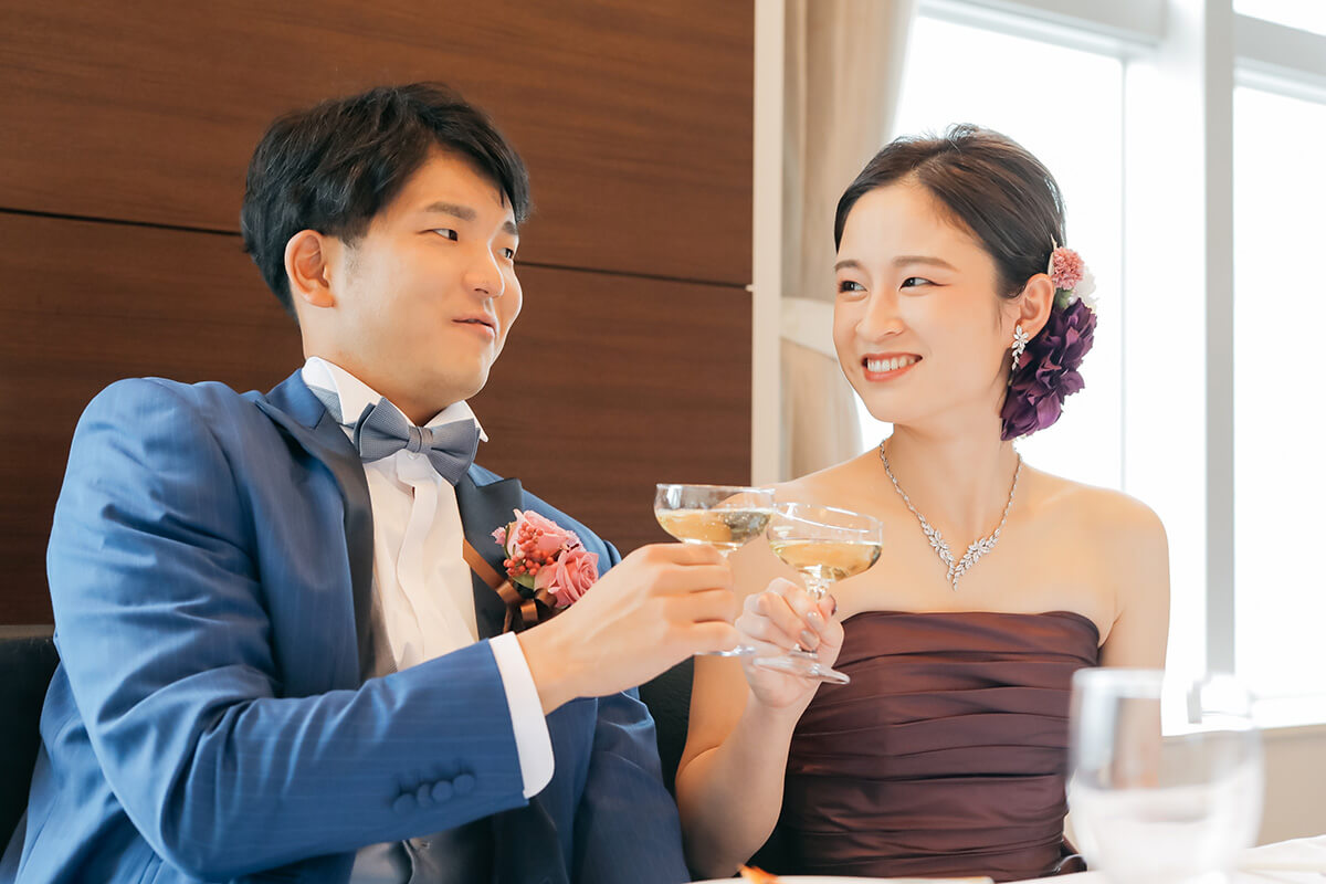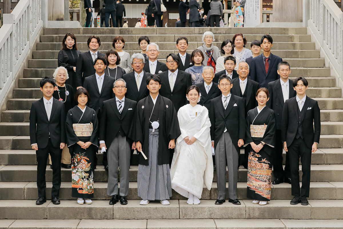 伊勢山皇大神宮にてご家族に見守られながら厳かに挙式を行いました。式後はホテルへ移動し、ドレスへお色直し。雰囲気をガラリと変えた華やかな姿に、家族から笑顔と歓声が。和と洋どちらも楽しめる、思い出深い一日となりました。