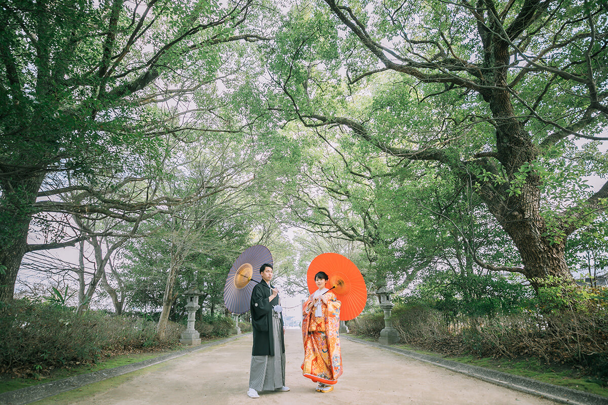 厳かな空気が漂う速谷神社で、ご家族に囲まれた心温まる神前式を挙げられたおふたり。挙式後は美しい境内でのフォトウェディングをゆったりと楽しみました。